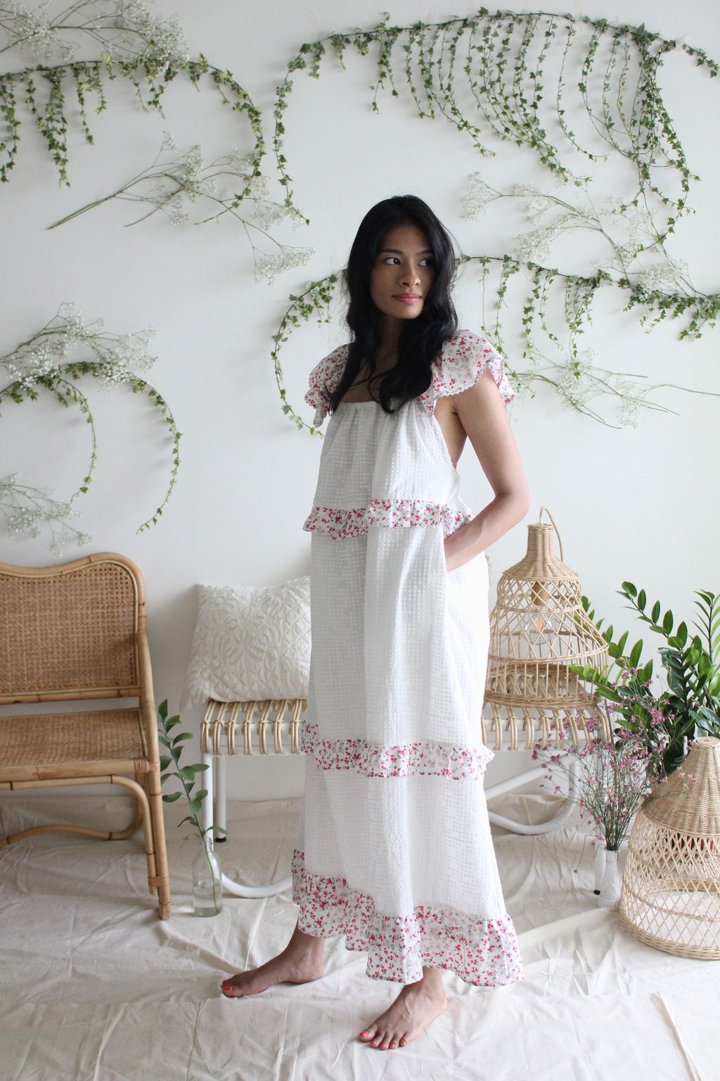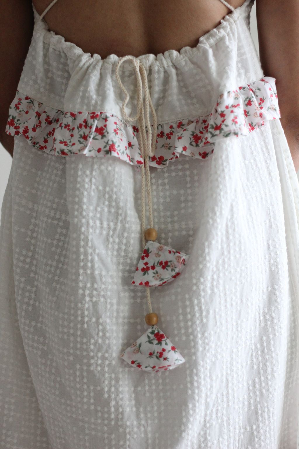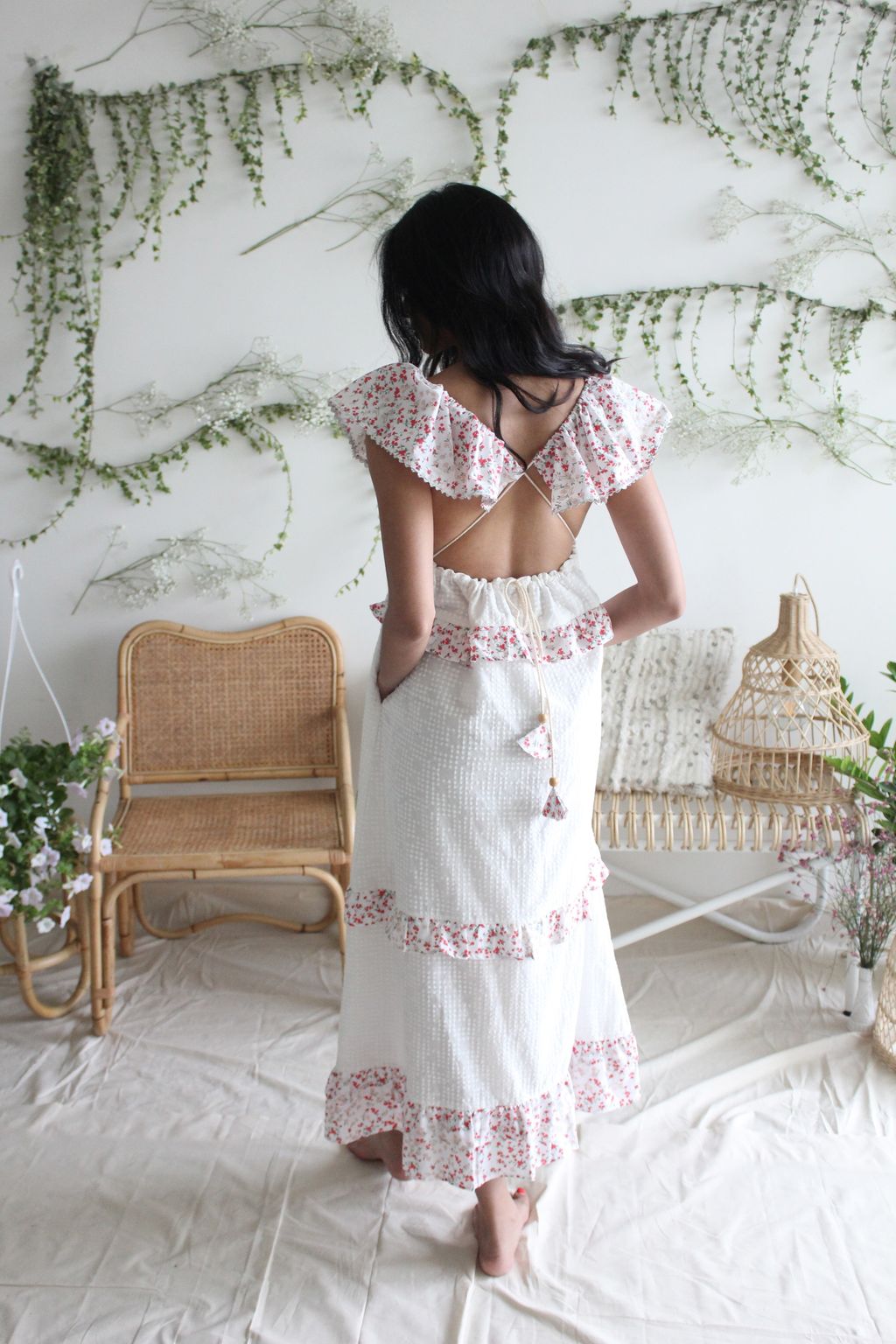 Made of 100% embroidered cotton of starry sparkle motif giving texture. And contrasting floral ruffled wings that crosses at the back with an adjustable rope tie and our signature tassel on the edges. And pockets to fill with stardust!