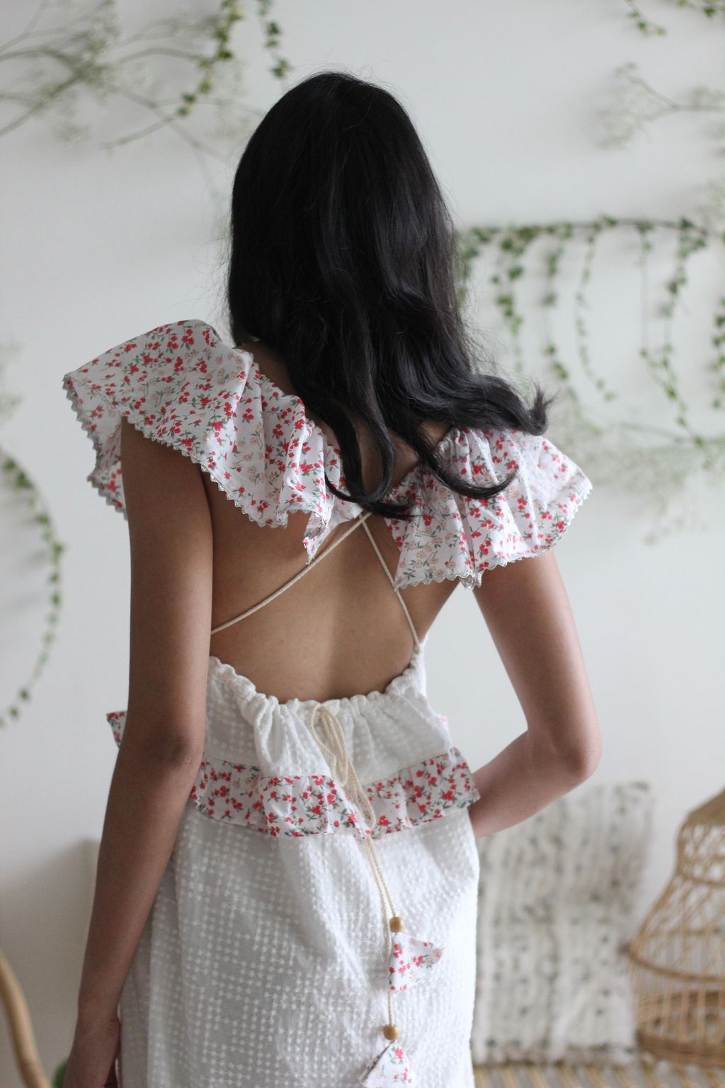 Our Angelica dress is demure yet playful at the same time. With a flirty bare back and flowy silhouette it is ideal for a relaxing day out while feeling cozy and light.