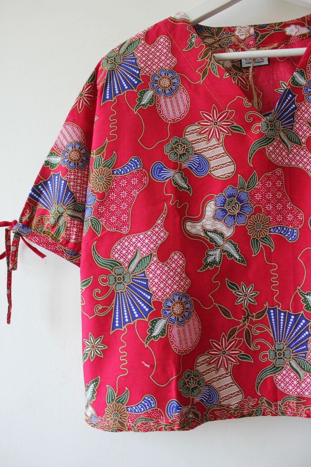 The simple V - neck batik top that suits most figures very well, 100% cotton batik, with sleeves that fall on the shoulders. Wear this with a plain bottom. Both work and play friendly, hey hey hey!