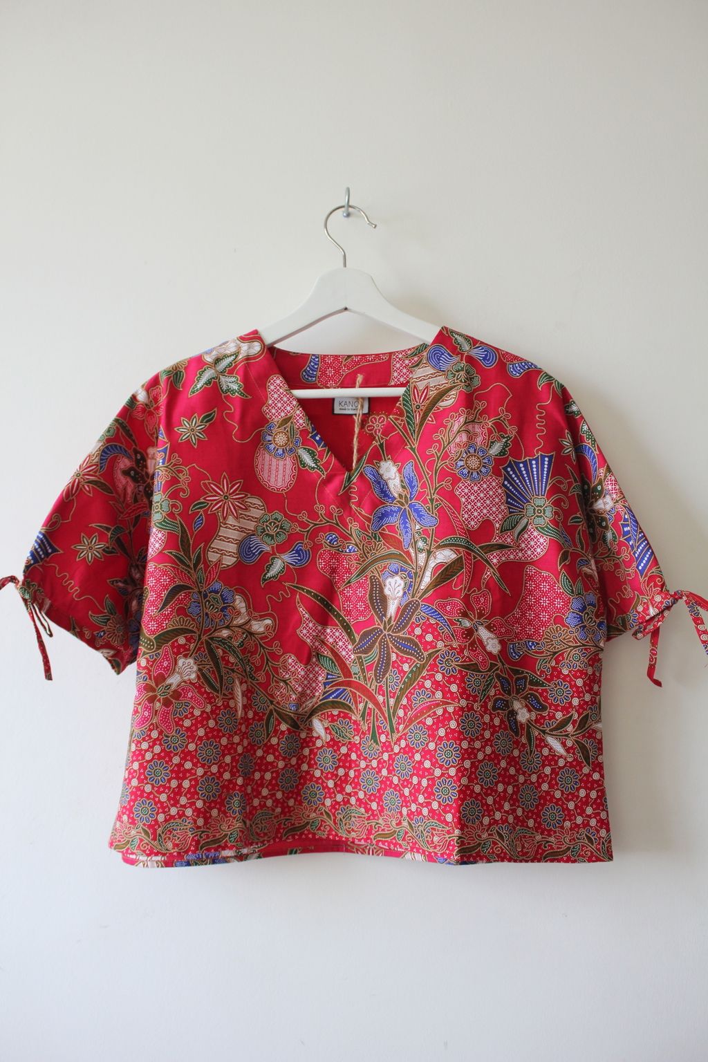 The simple V - neck batik top that suits most figures very well, 100% cotton batik, with sleeves that fall on the shoulders. Wear this with a plain bottom. Both work and play friendly, hey hey hey!