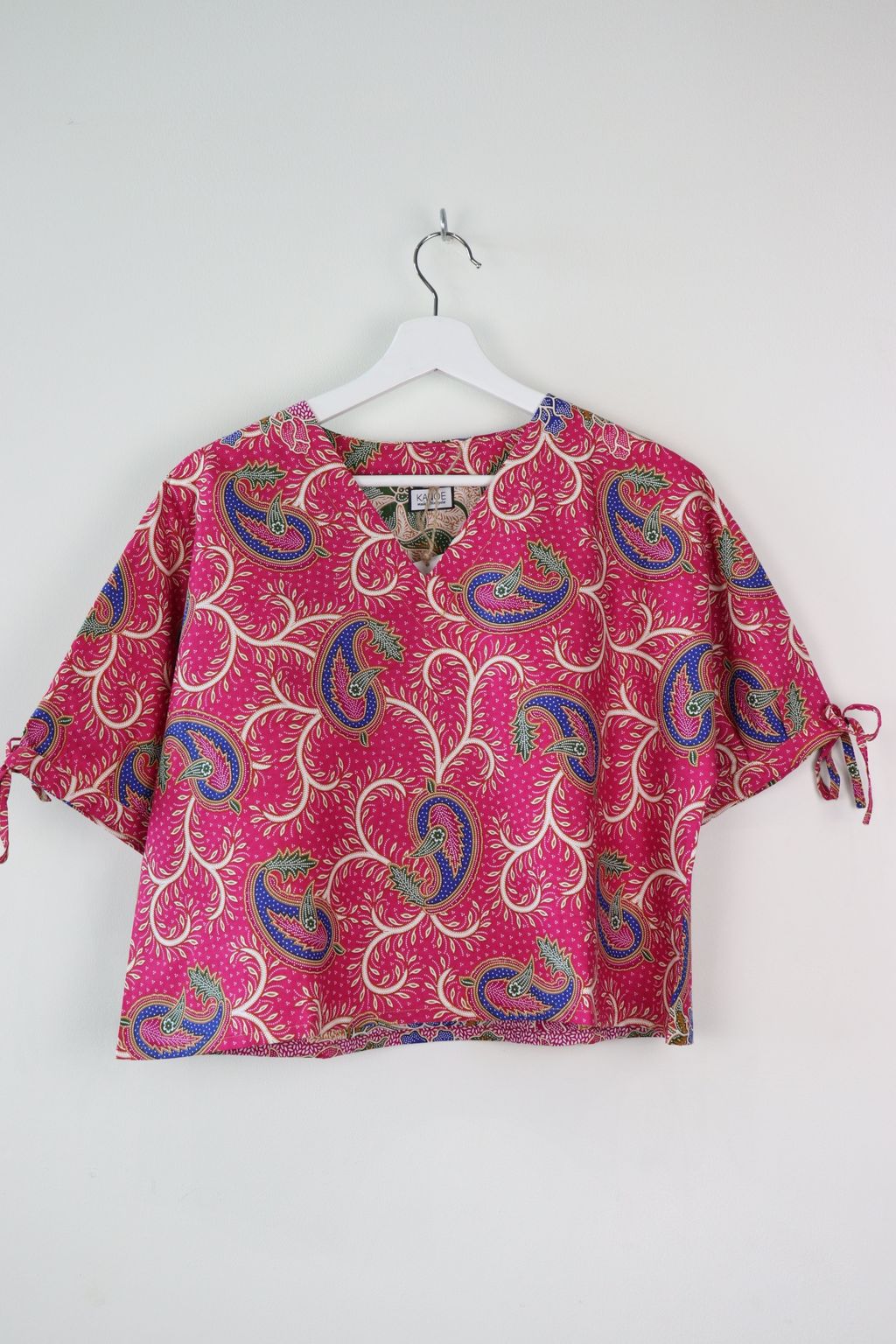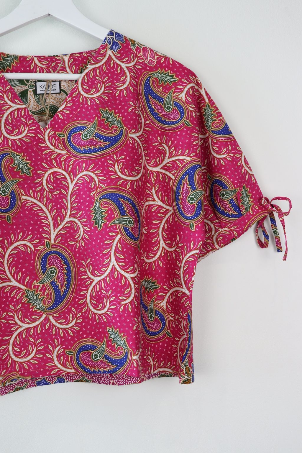 The simple V - neck batik top that suits most figures very well. With sleeves that fall on the shoulders. Wear this with a plain bottom. Both work and play friendly !
