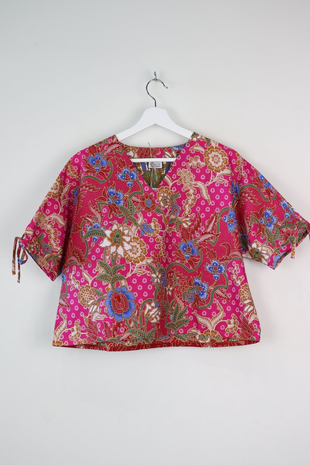 The simple V - neck batik top that suits most figures very well. With sleeves that fall on the shoulders. Wear this with a plain bottom. Both work and play friendly !