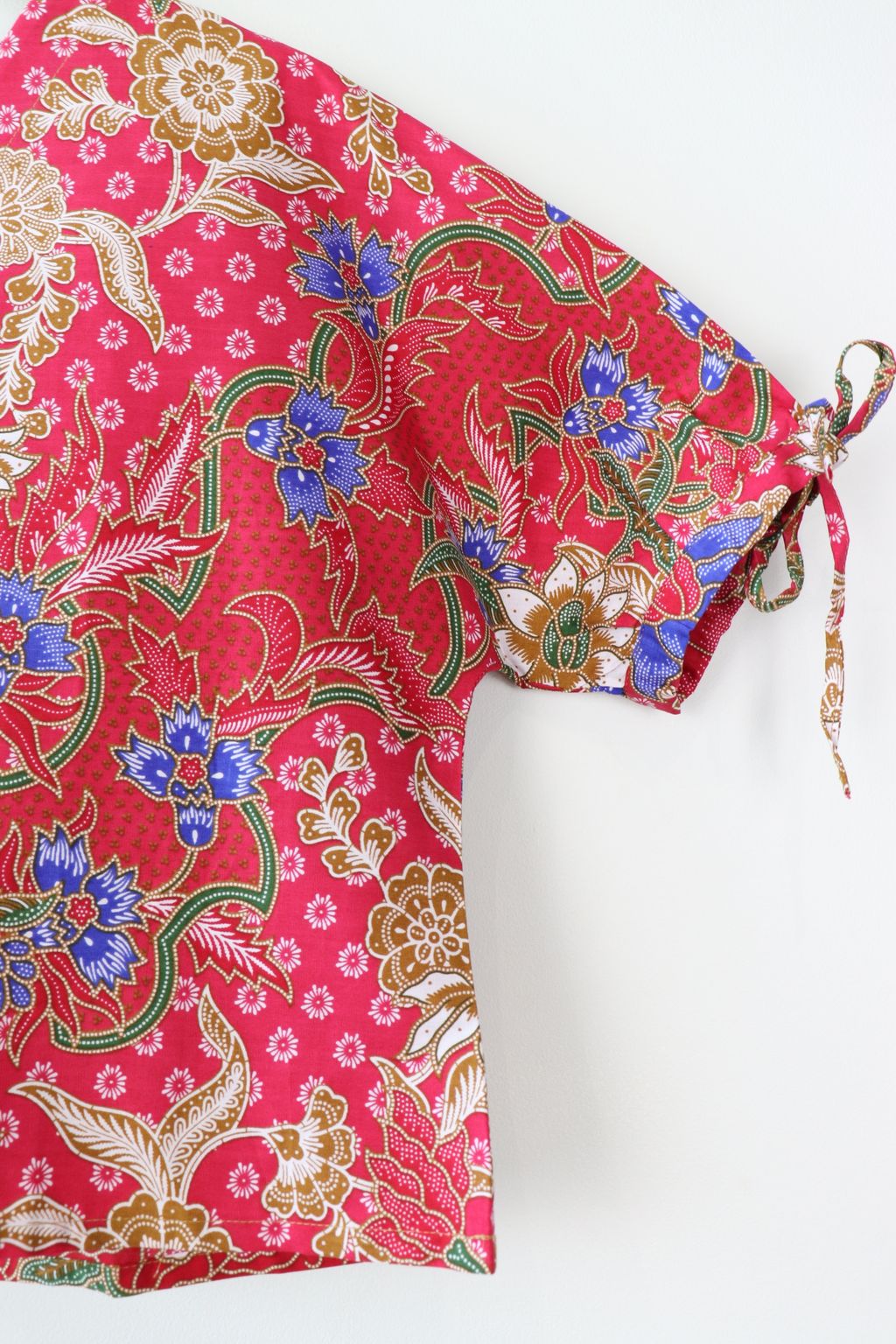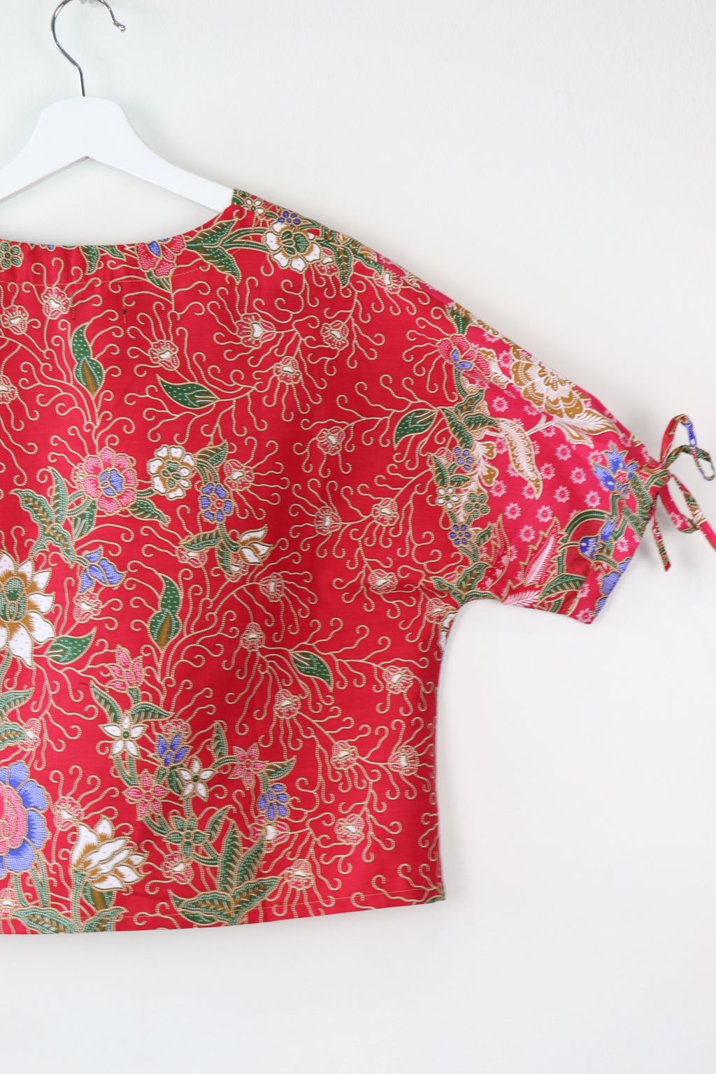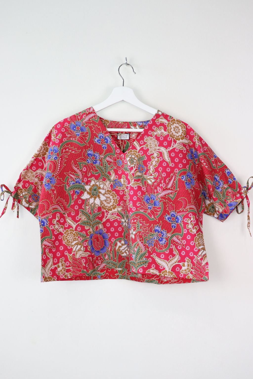 The simple V - neck batik top that suits most figures very well. With sleeves that fall on the shoulders. Wear this with a plain bottom. Both work and play friendly !