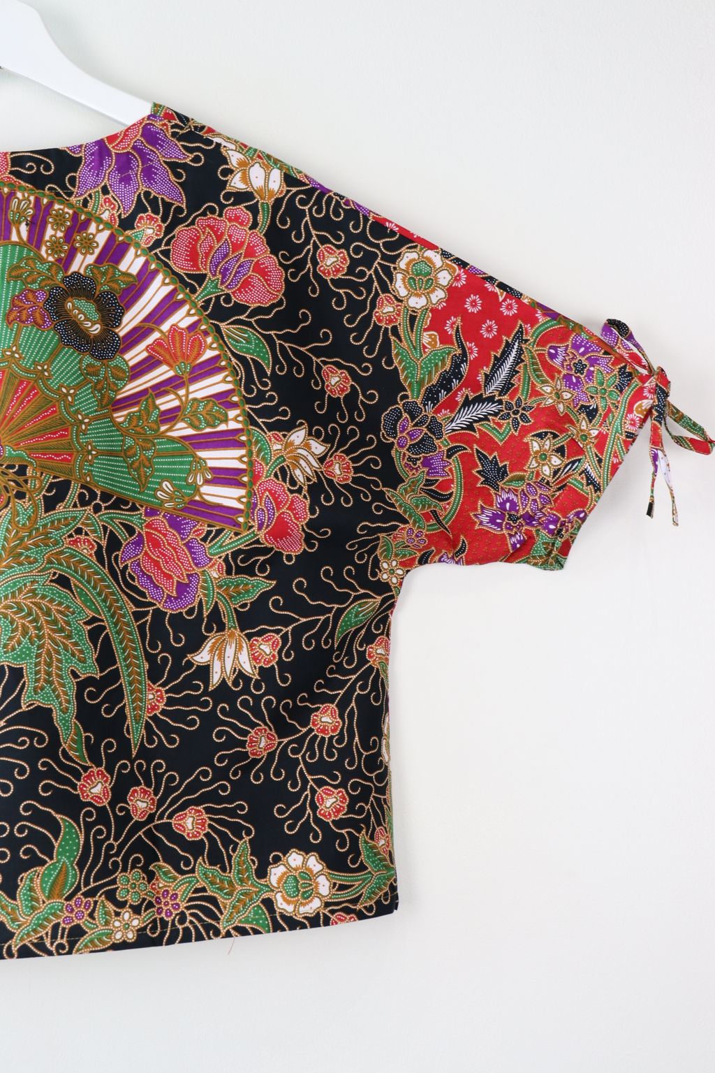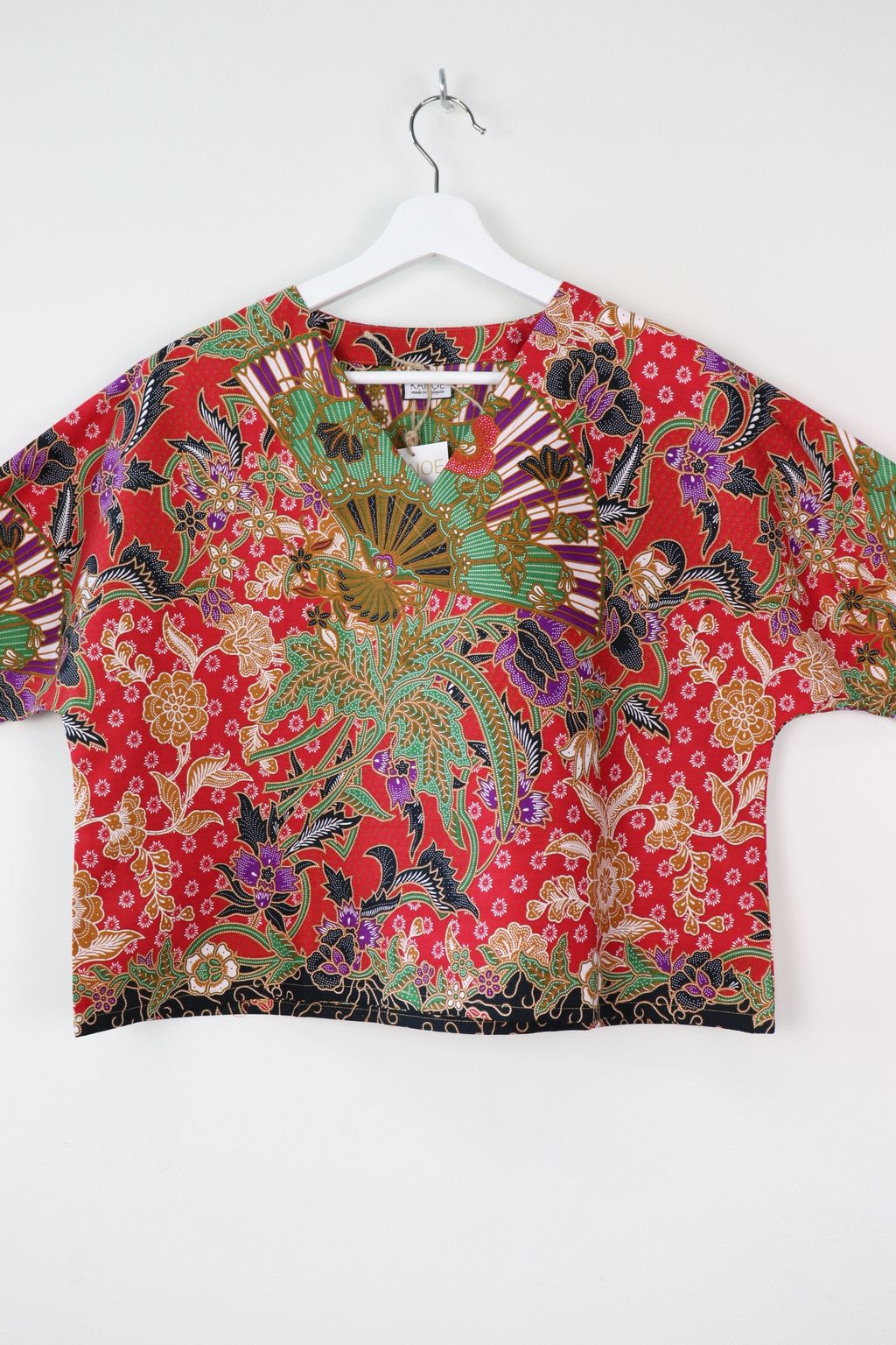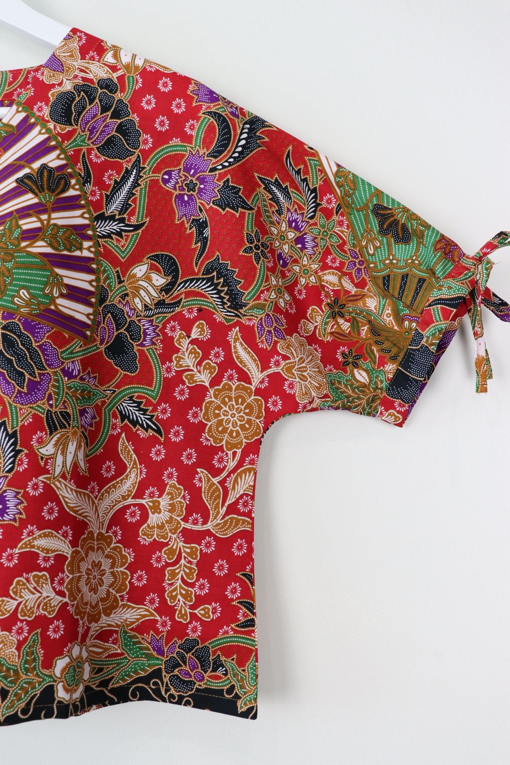 The simple V - neck batik top that suits most figures very well. With sleeves that fall on the shoulders. Wear this with a plain bottom. Both work and play friendly !