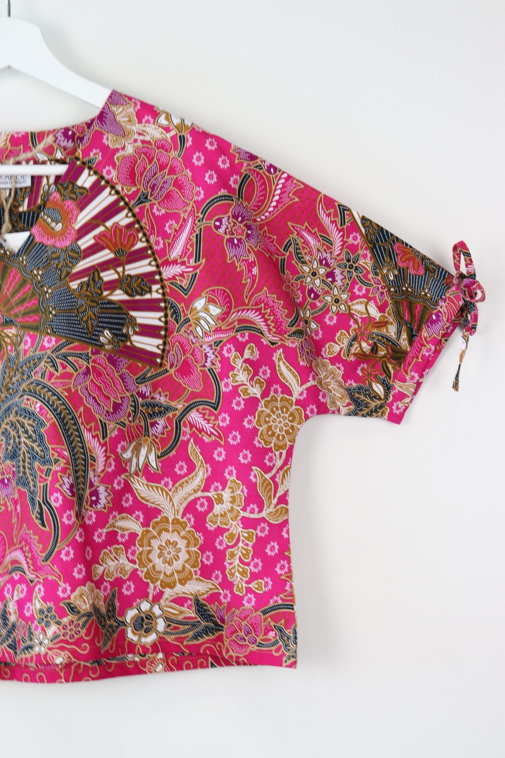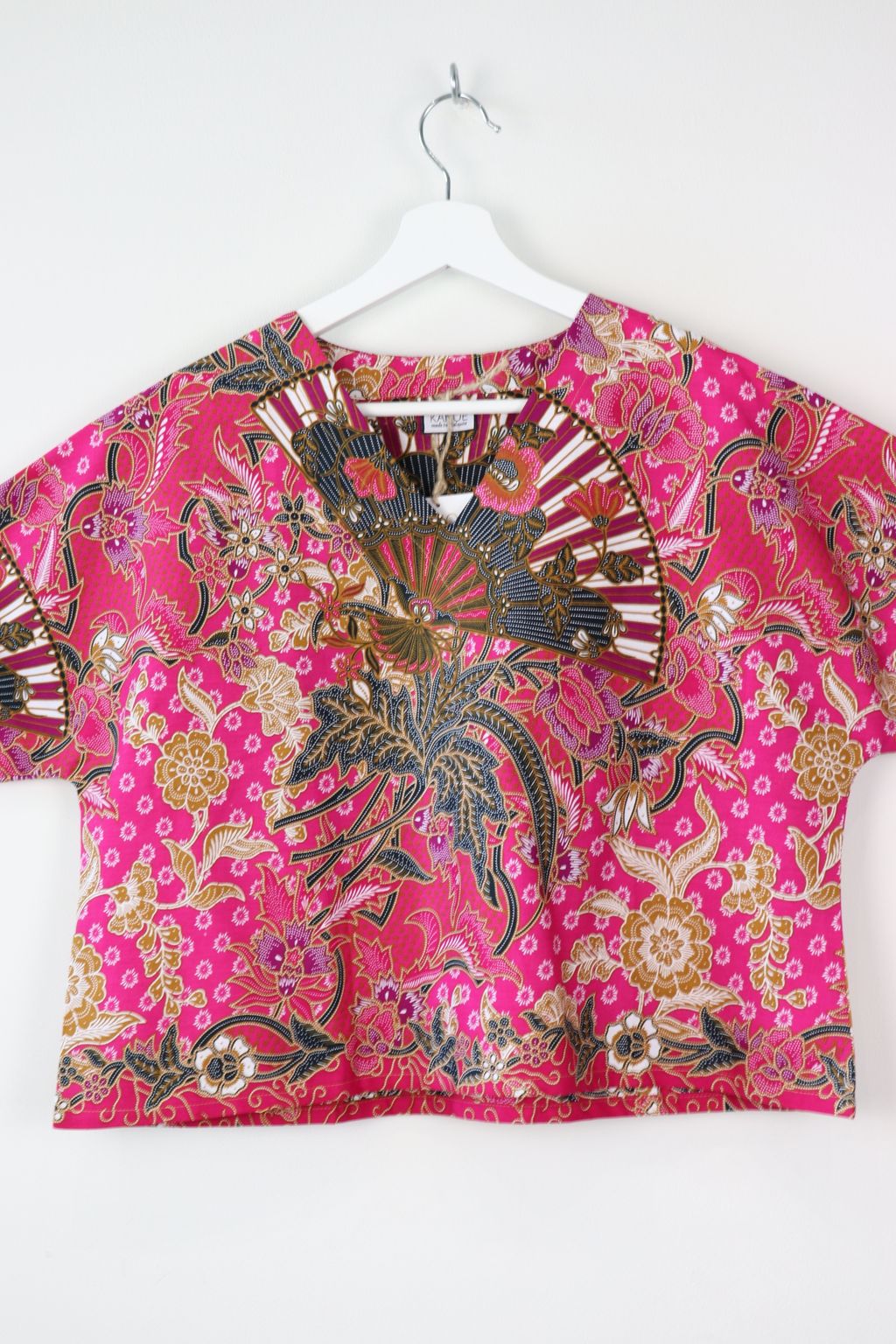 The simple V - neck batik top that suits most figures very well. With sleeves that fall on the shoulders. Wear this with a plain bottom. Both work and play friendly !