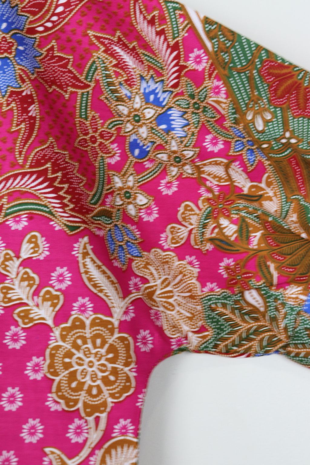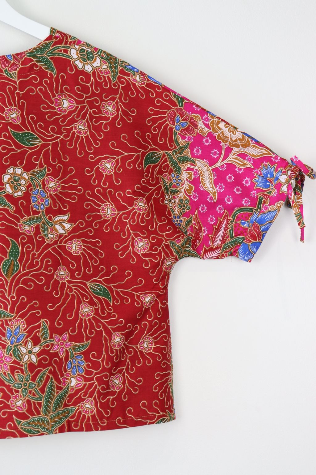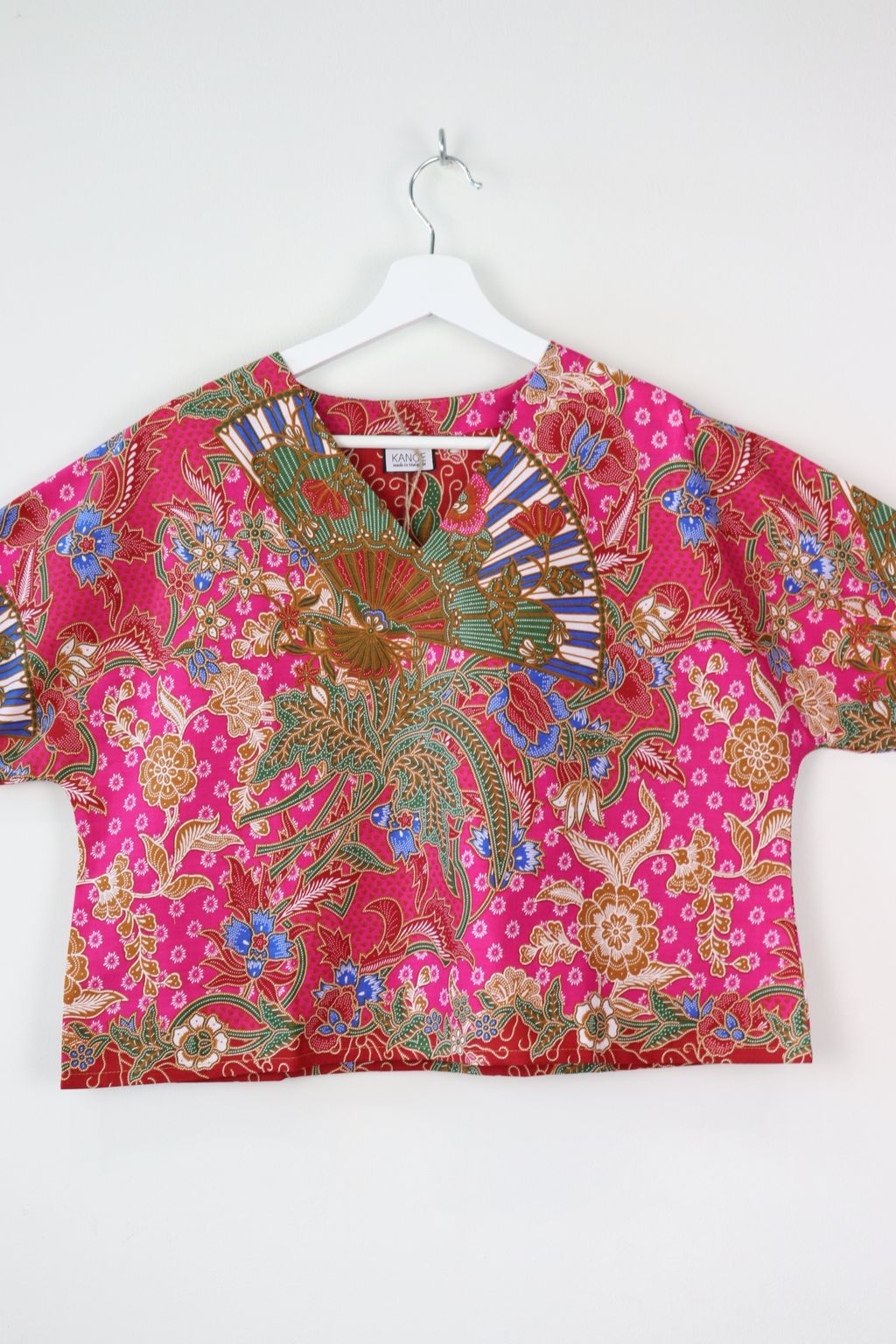 The simple V - neck batik top that suits most figures very well. With sleeves that fall on the shoulders. Wear this with a plain bottom. Both work and play friendly !