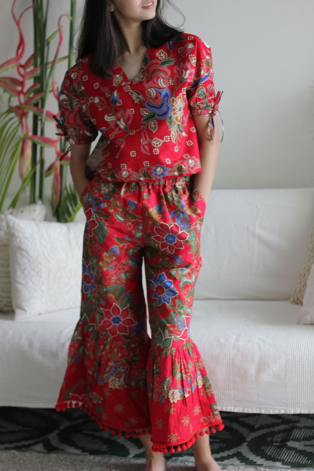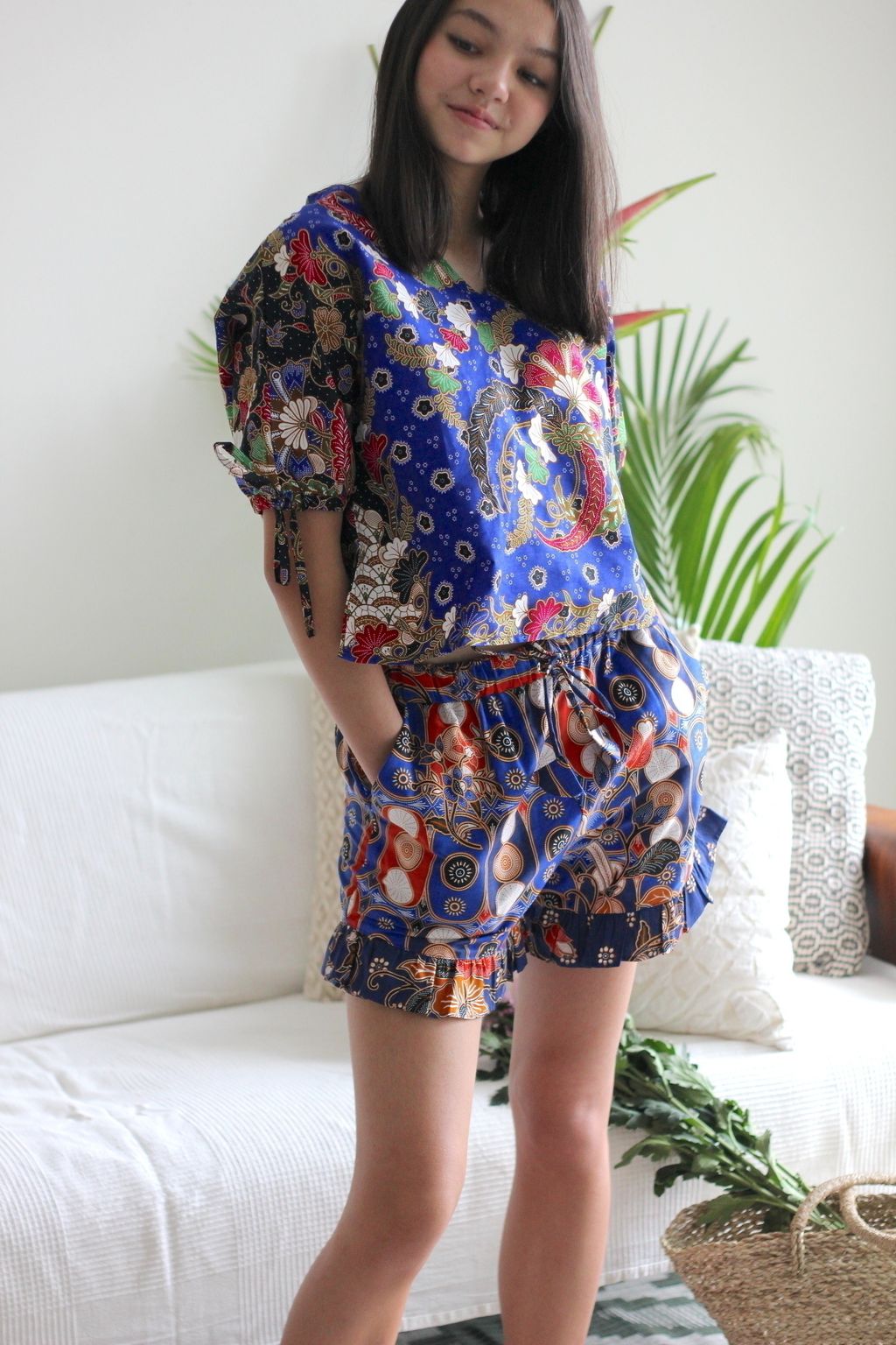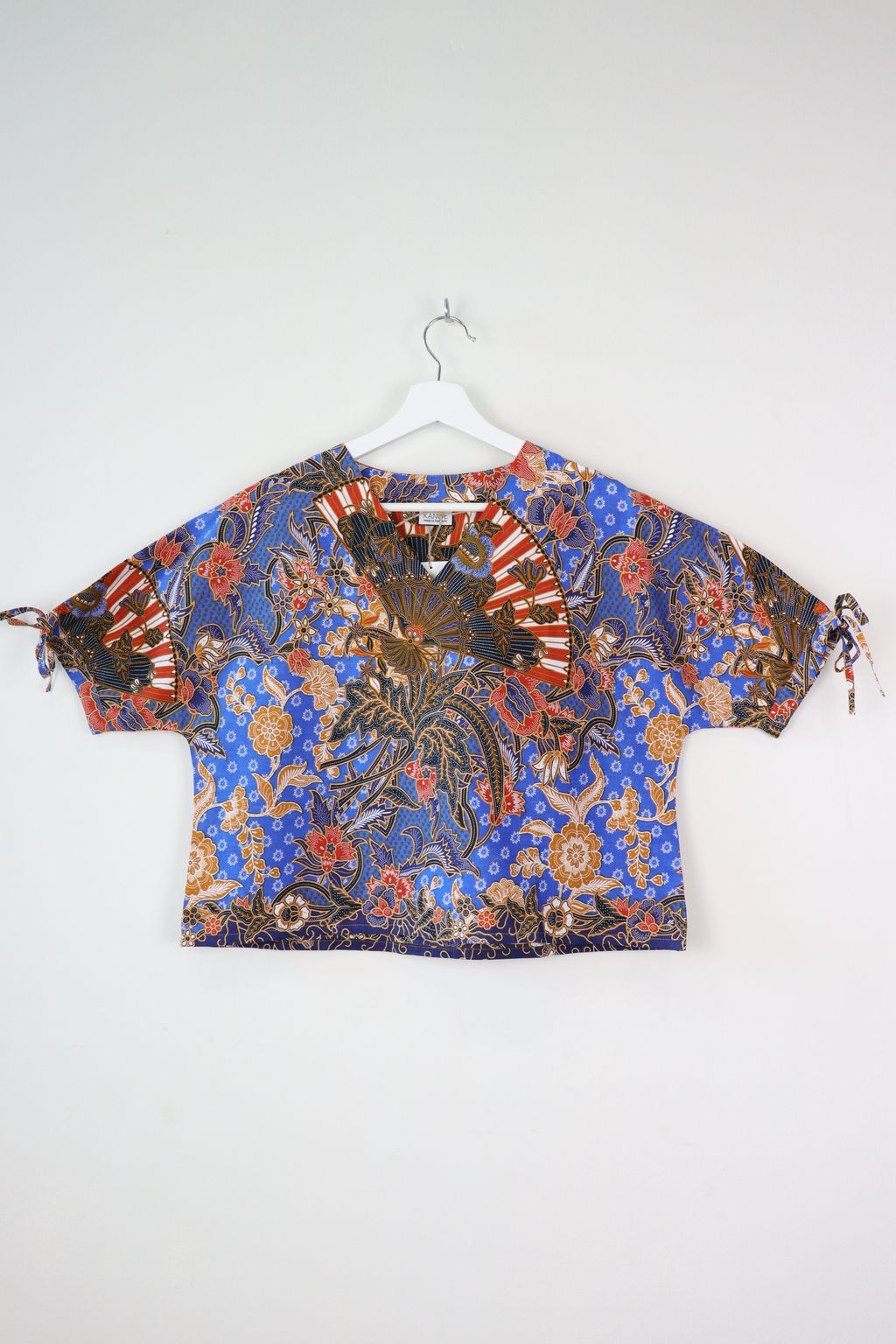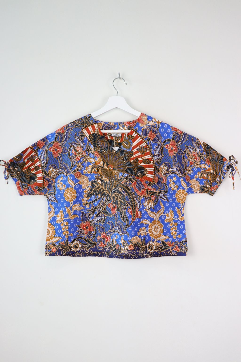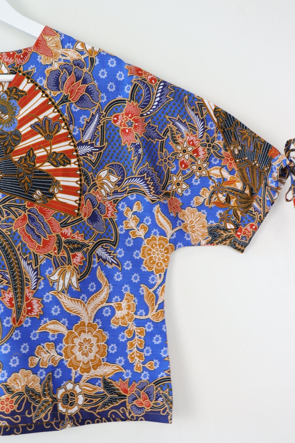 The simple V - neck batik top that suits most figures very well. With sleeves that fall on the shoulders. Wear this with a plain bottom. Both work and play friendly !