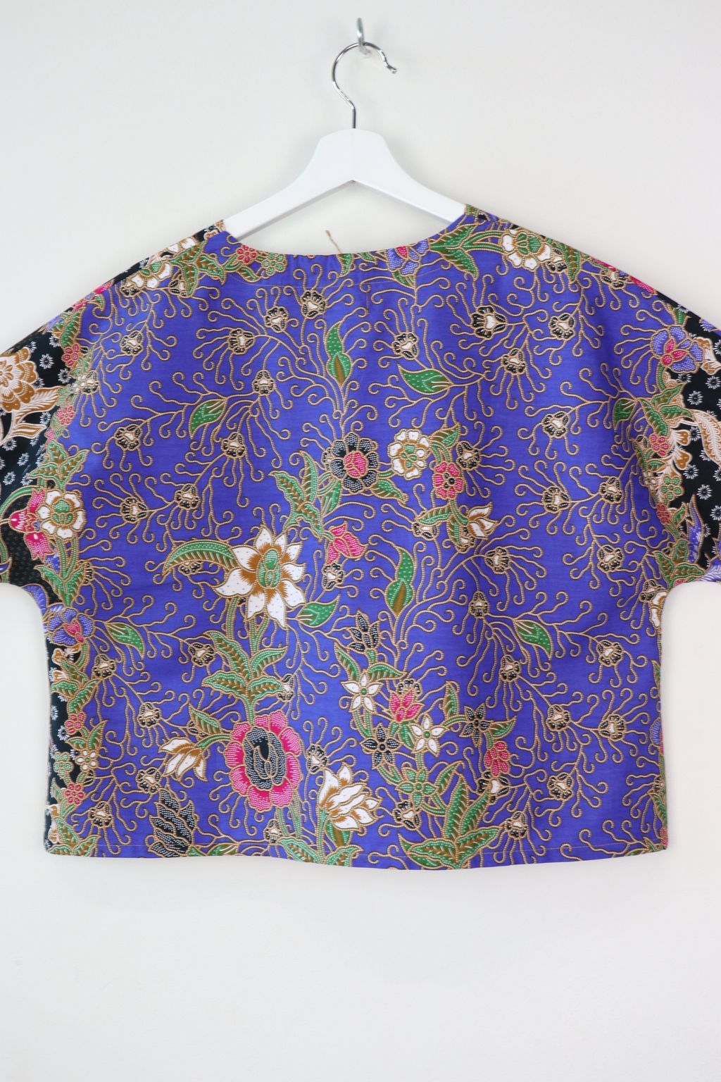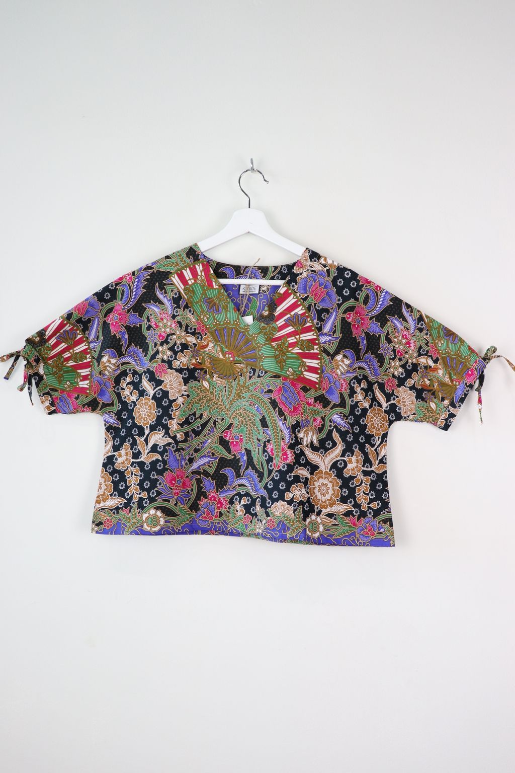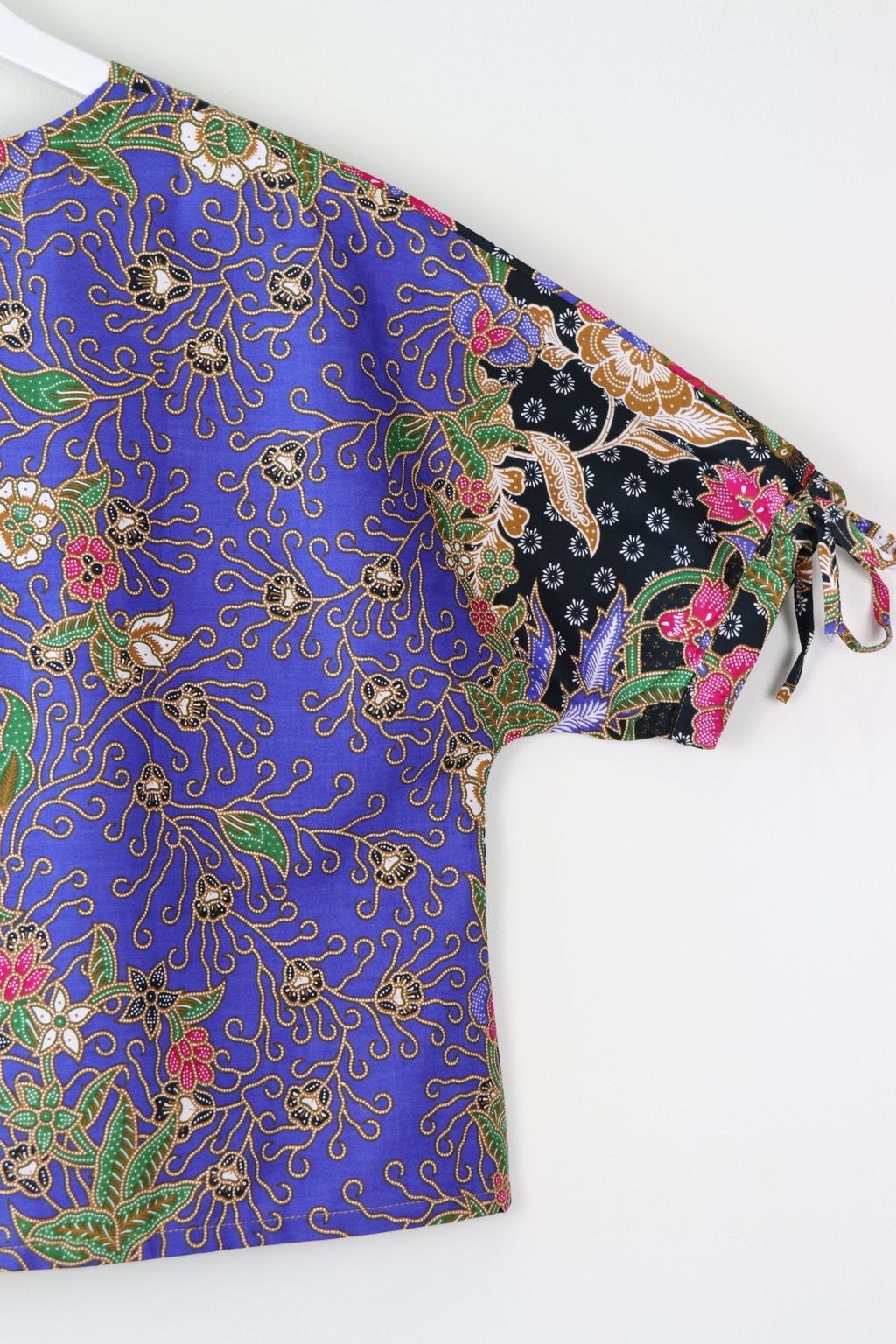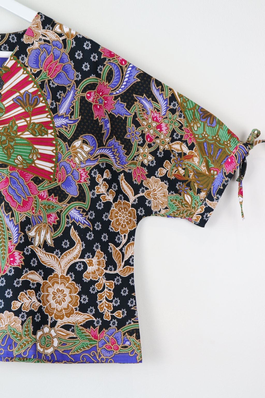 The simple V - neck batik top that suits most figures very well. With sleeves that fall on the shoulders. Wear this with a plain bottom. Both work and play friendly !