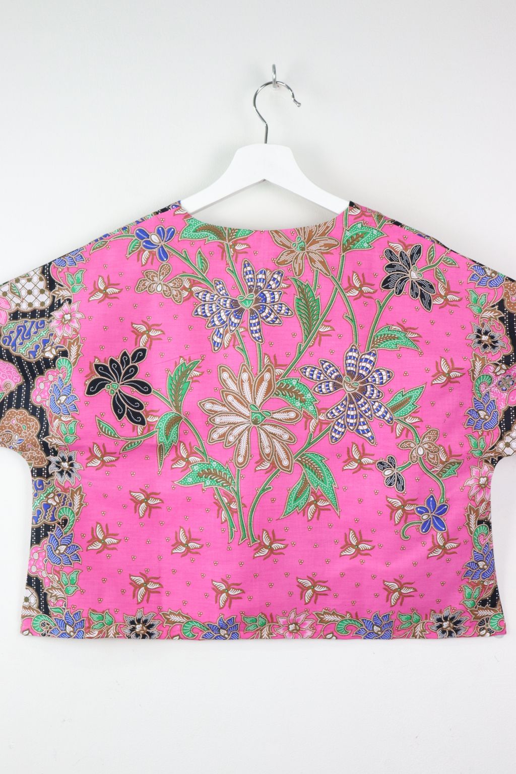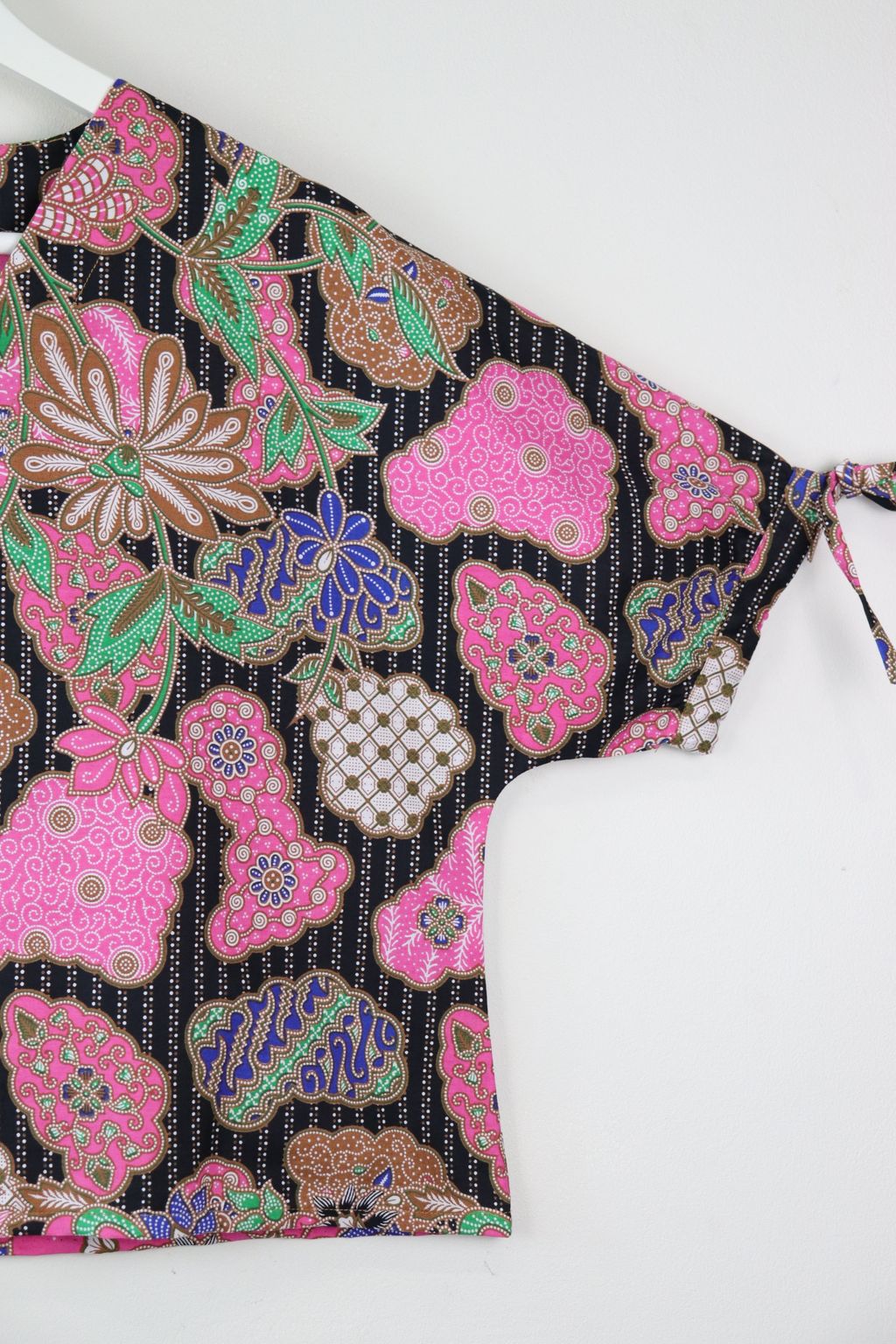 The simple V - neck batik top that suits most figures very well. With sleeves that fall on the shoulders. Wear this with a plain bottom. Both work and play friendly !