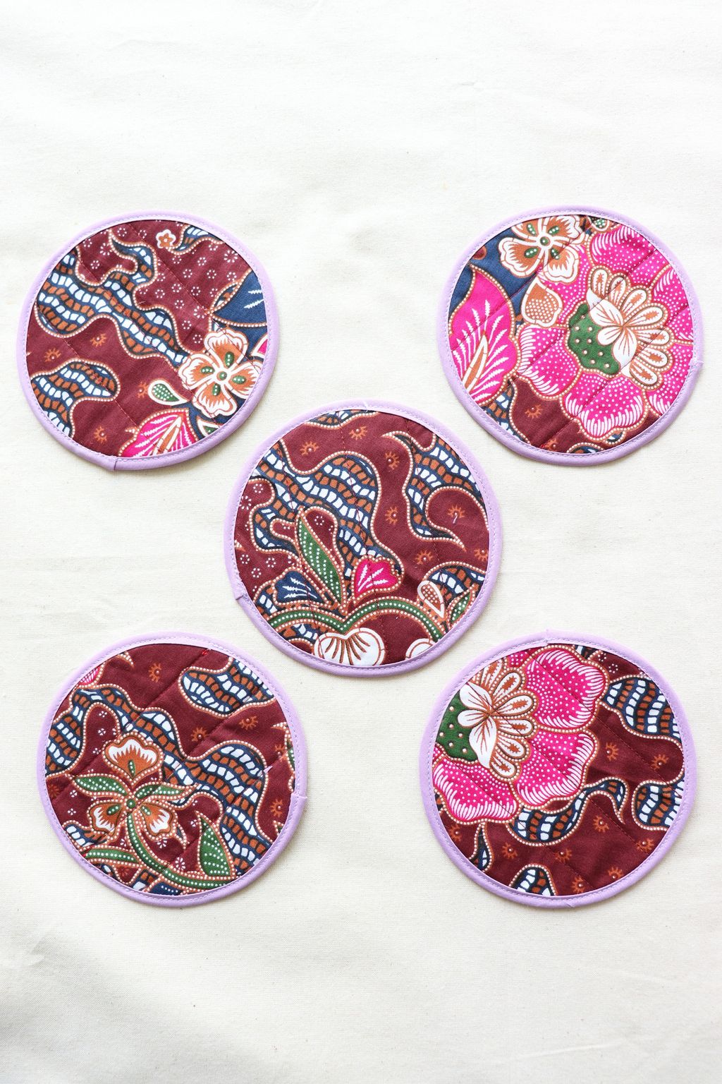 Our tailors had fun mixing and matching the batik prints of these reversible digital and handmade batik textile coasters.