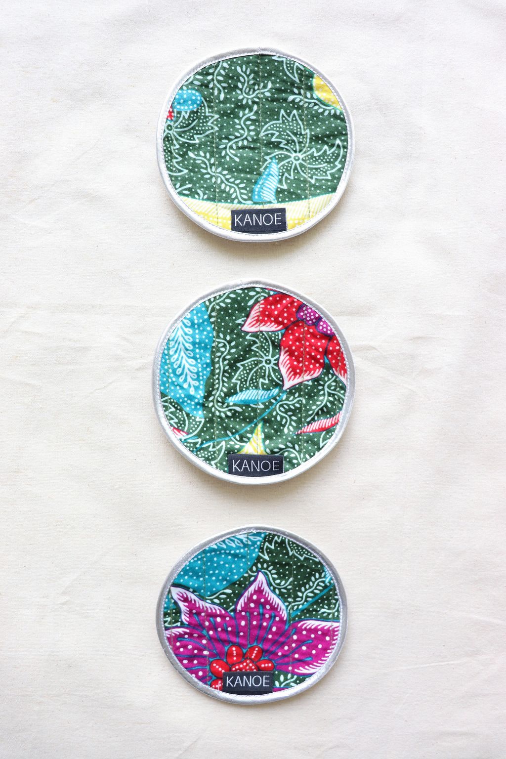 Our tailors had fun mixing and matching the batik prints of these reversible digital and handmade batik textile coasters.