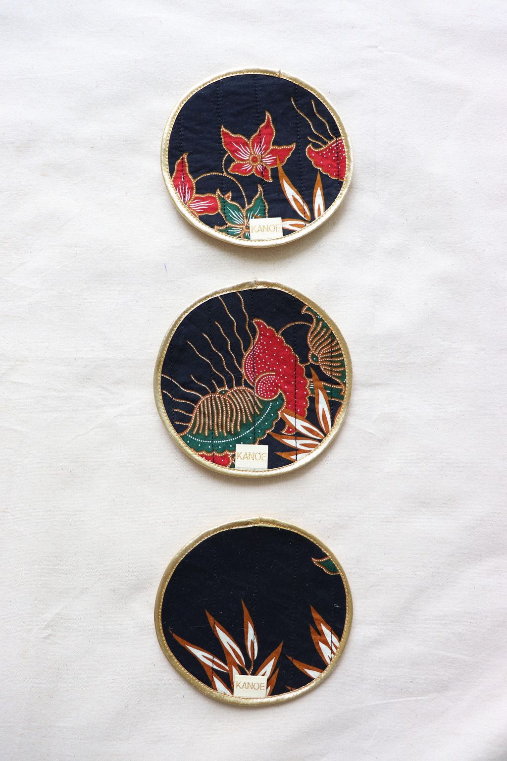 Our tailors had fun mixing and matching the batik prints of these reversible digital and handmade batik textile coasters.
