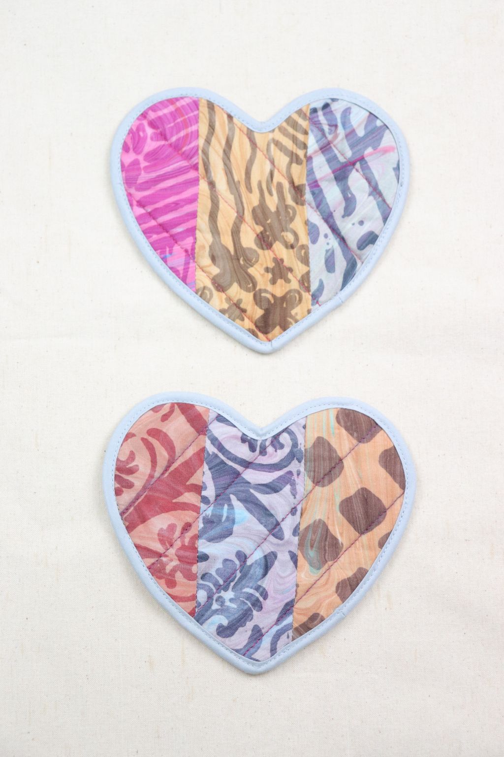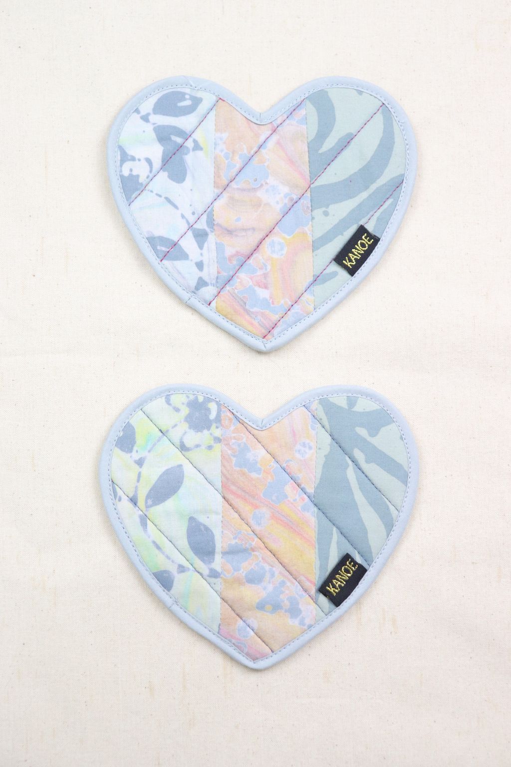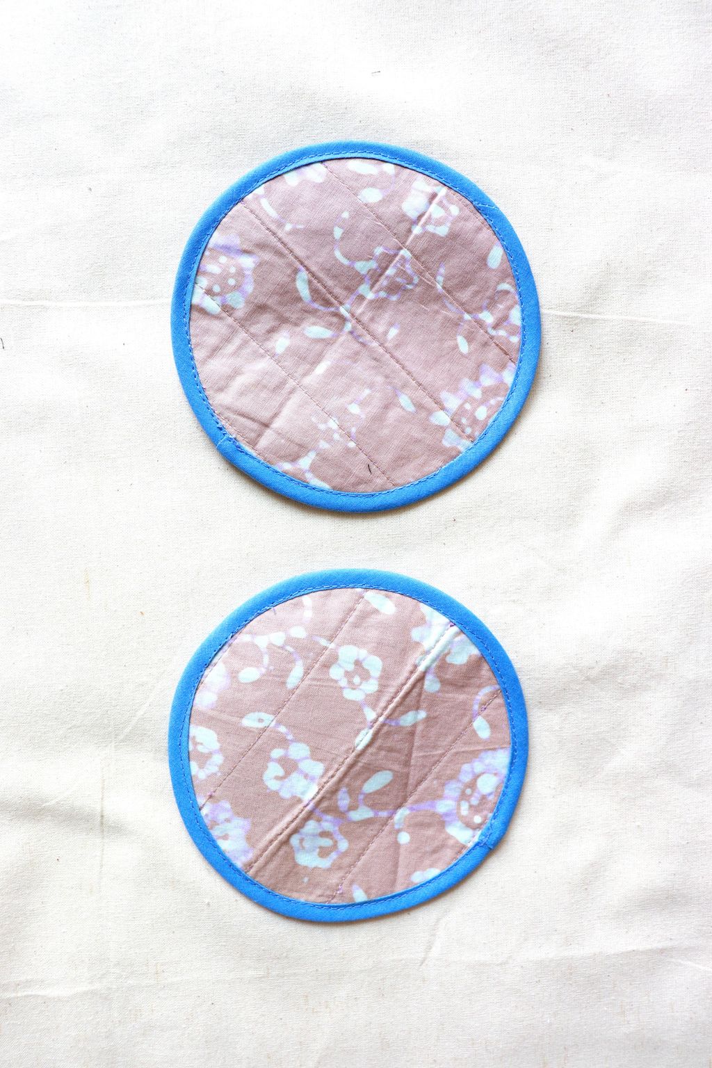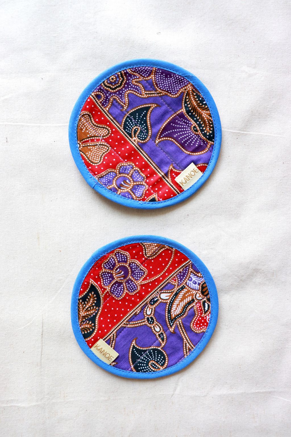 Our tailors had fun mixing and matching the batik prints of these reversible digital and handmade batik textile coasters.