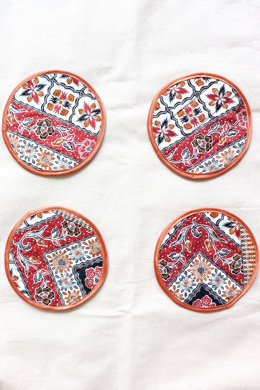Our tailors had fun mixing and matching the batik prints of these reversible digital and handmade batik textile coasters.