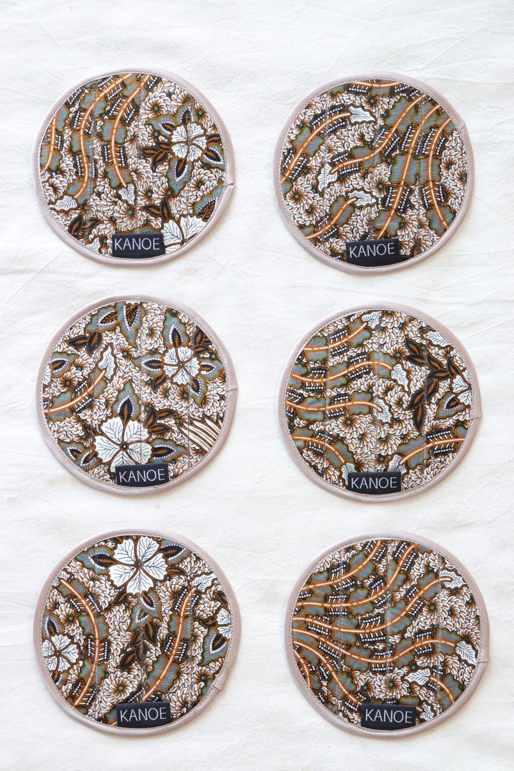 Our tailors had fun mixing and matching the batik prints of these reversible digital and handmade batik textile coasters.