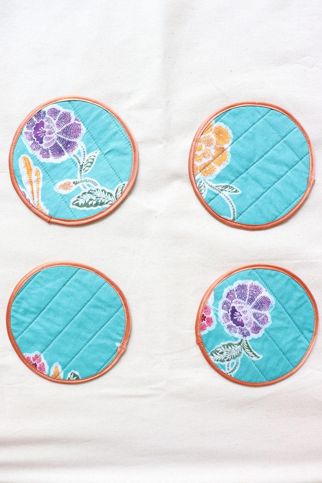 Our tailors had fun mixing and matching the batik prints of these reversible digital and handmade batik textile coasters.