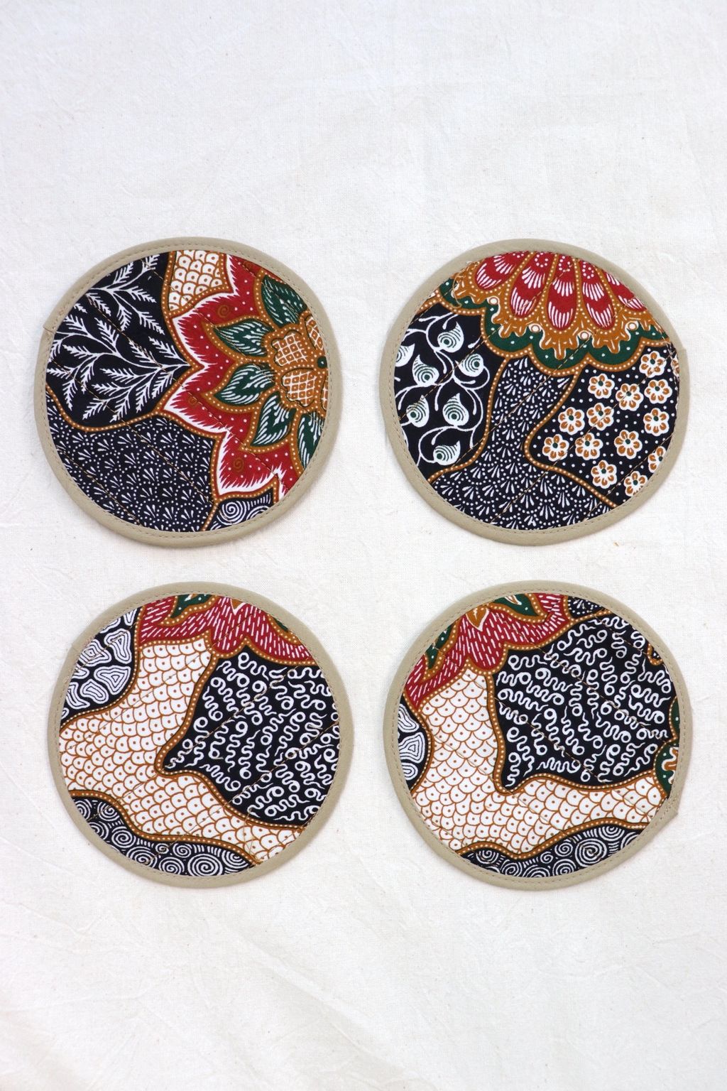 Our tailors had fun mixing and matching the batik prints of these reversible digital and handmade batik textile coasters.