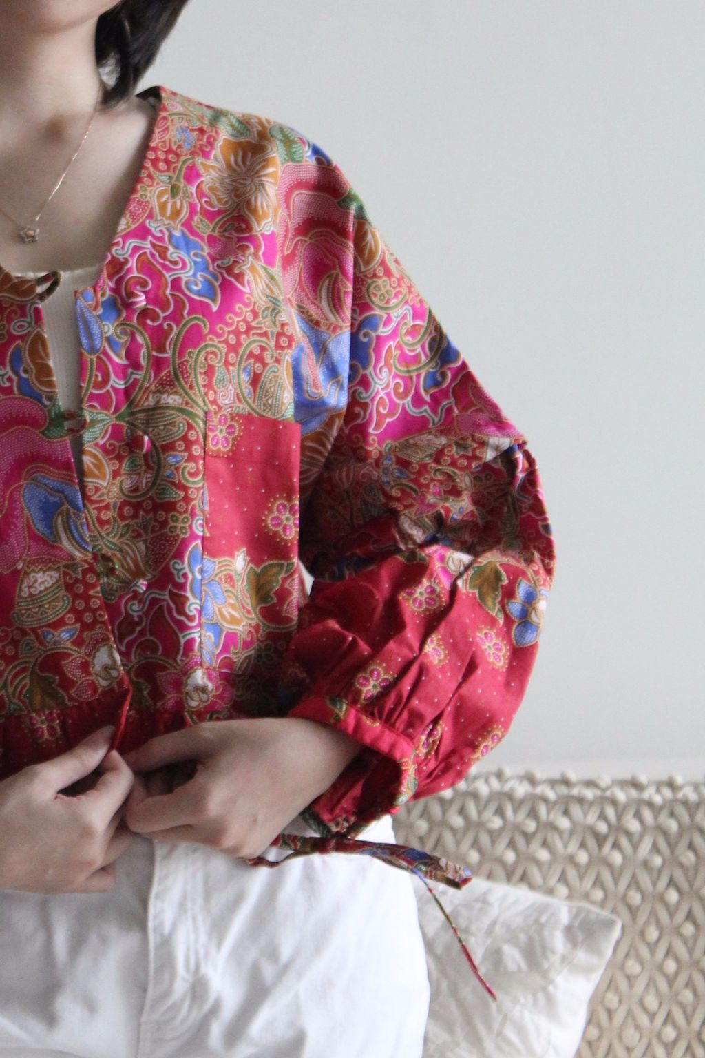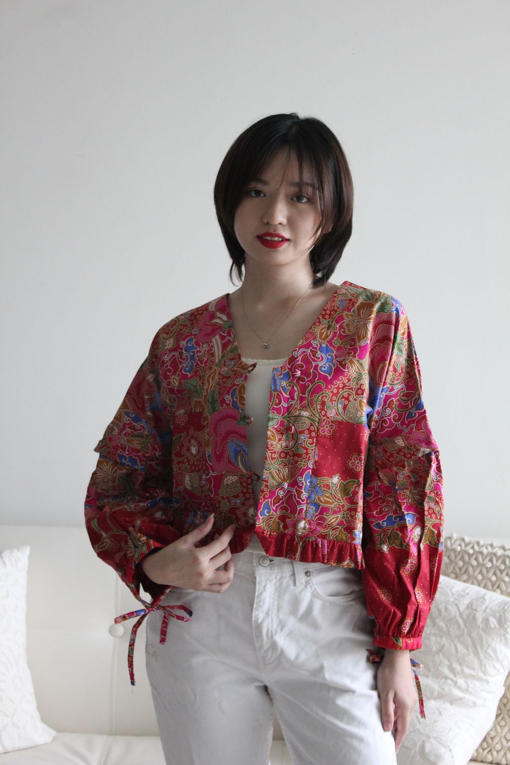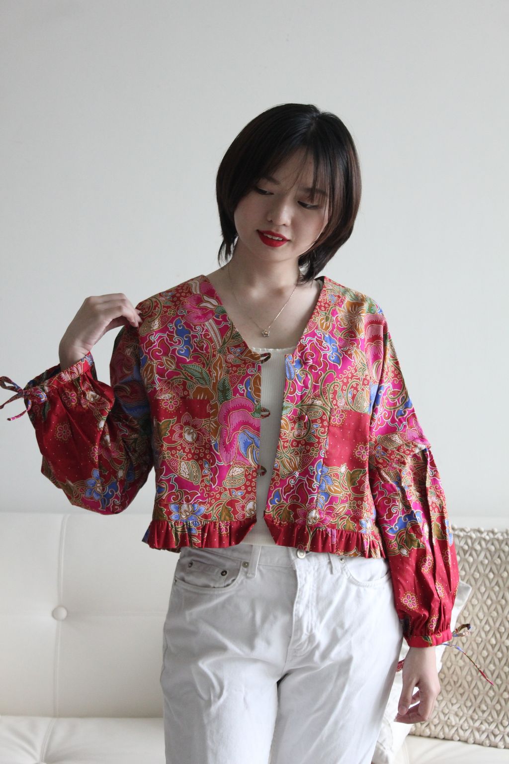 Wear this as a cropped jacket or even as a top! Extremely versatile. For casual or even professional. Button it up or leave the button open. Sleeves can be also worn up or down! This cropped jacket is a statement piece. Can be worn to work or even on a day out! As you like. And Pockets to put all your ang pao’s this Chinese New year !
