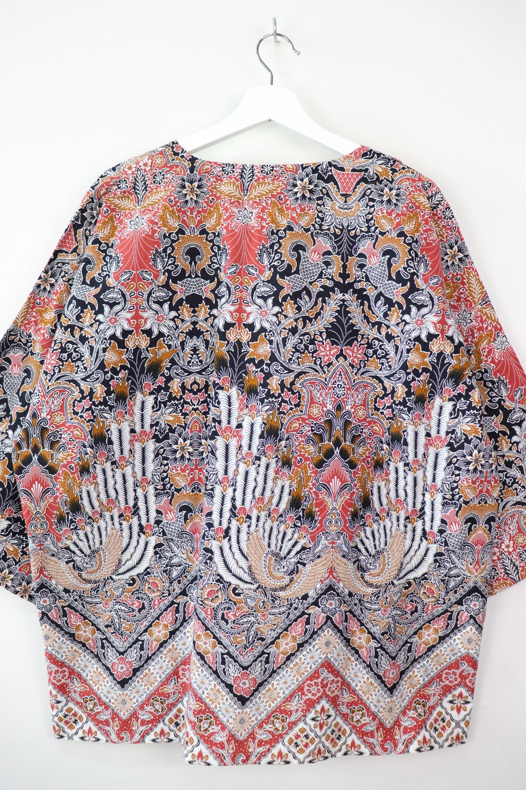 When we are stuck at home wearing a basic spaghetti strap top at home and the door bell rings, throw on this kimono before heading out to collect that parcel. Or if your boss calls you last minute for a zoom call. Throw on this batik kimono!
