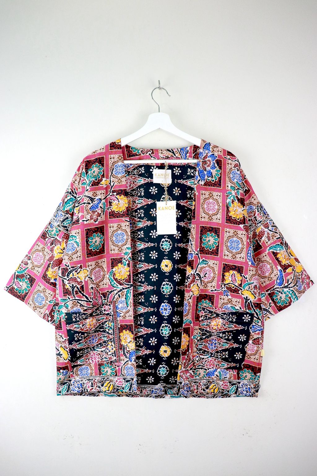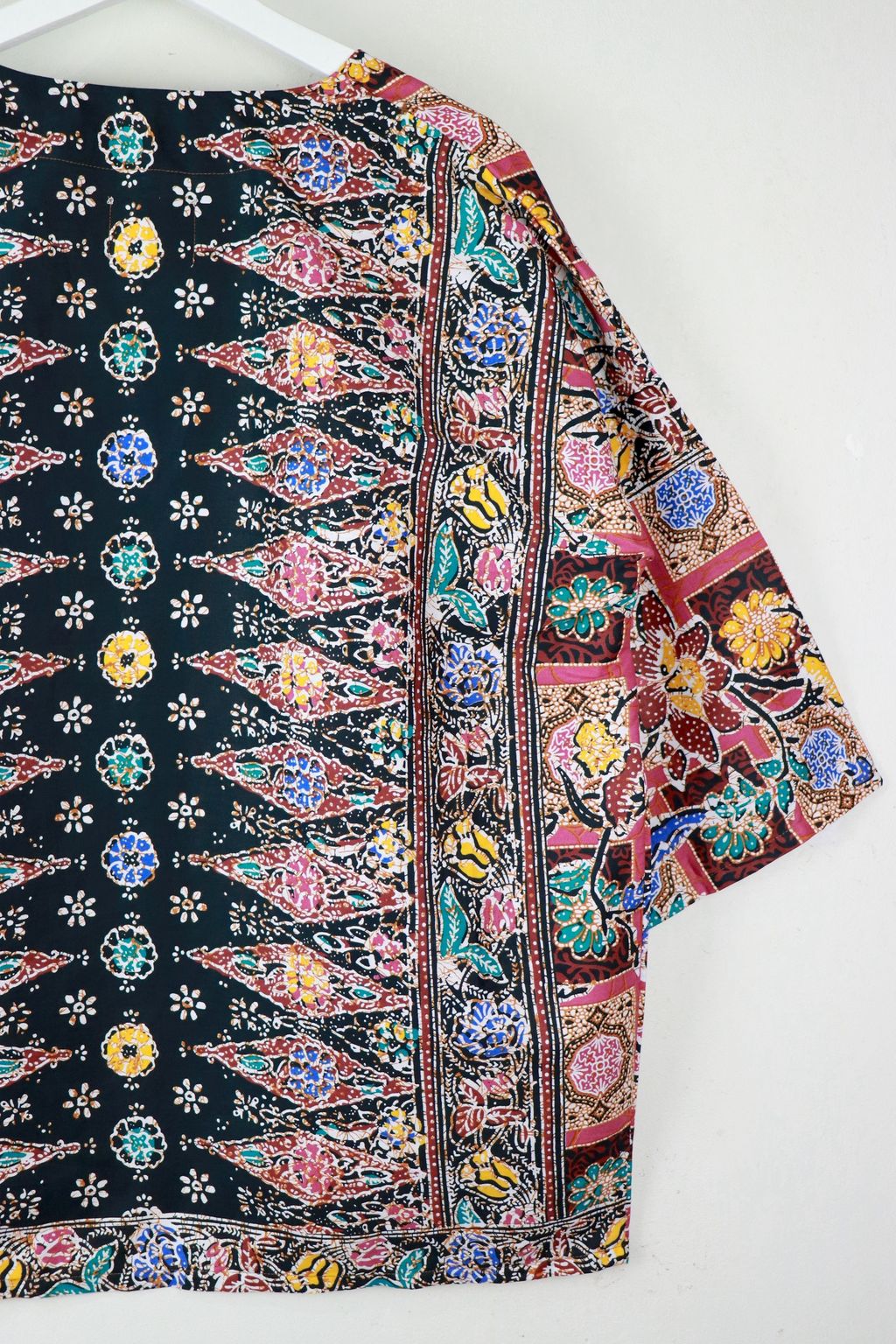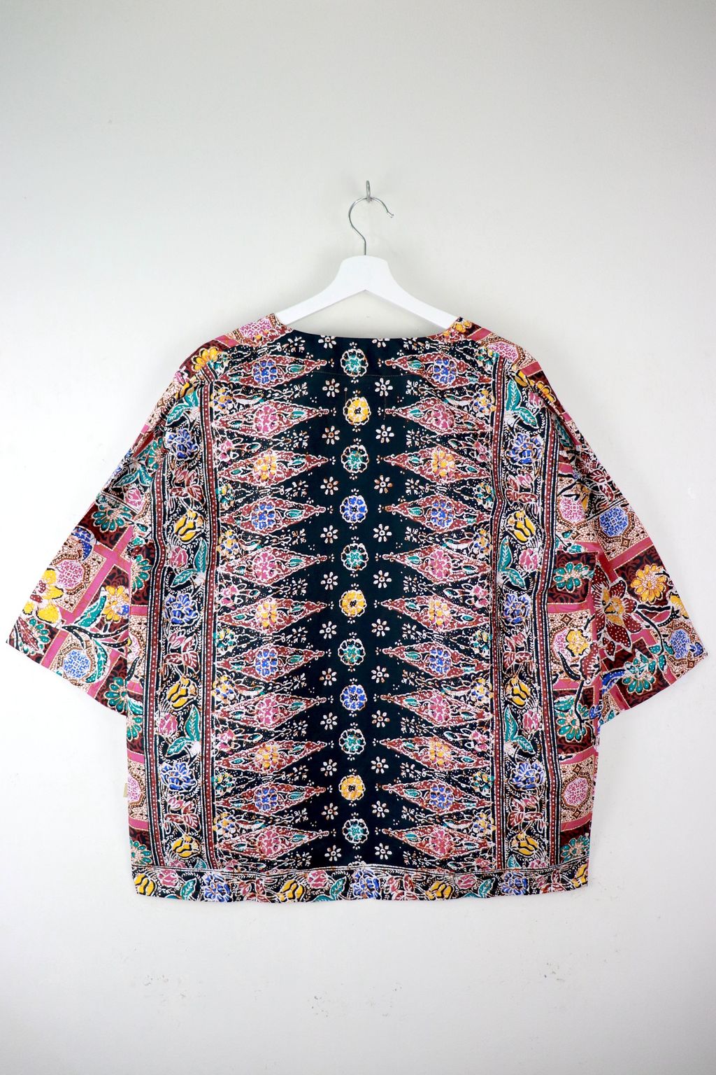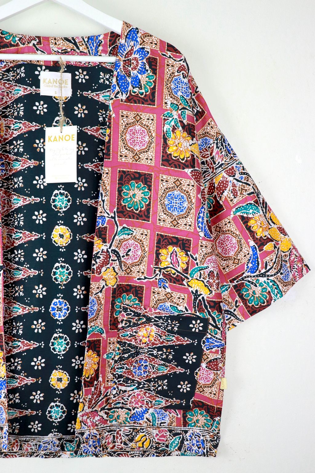 When we are stuck at home wearing a basic spaghetti strap top at home and the door bell rings, throw on this kimono before heading out to collect that parcel. Or if your boss calls you last minute for a zoom call. Throw on this batik kimono!