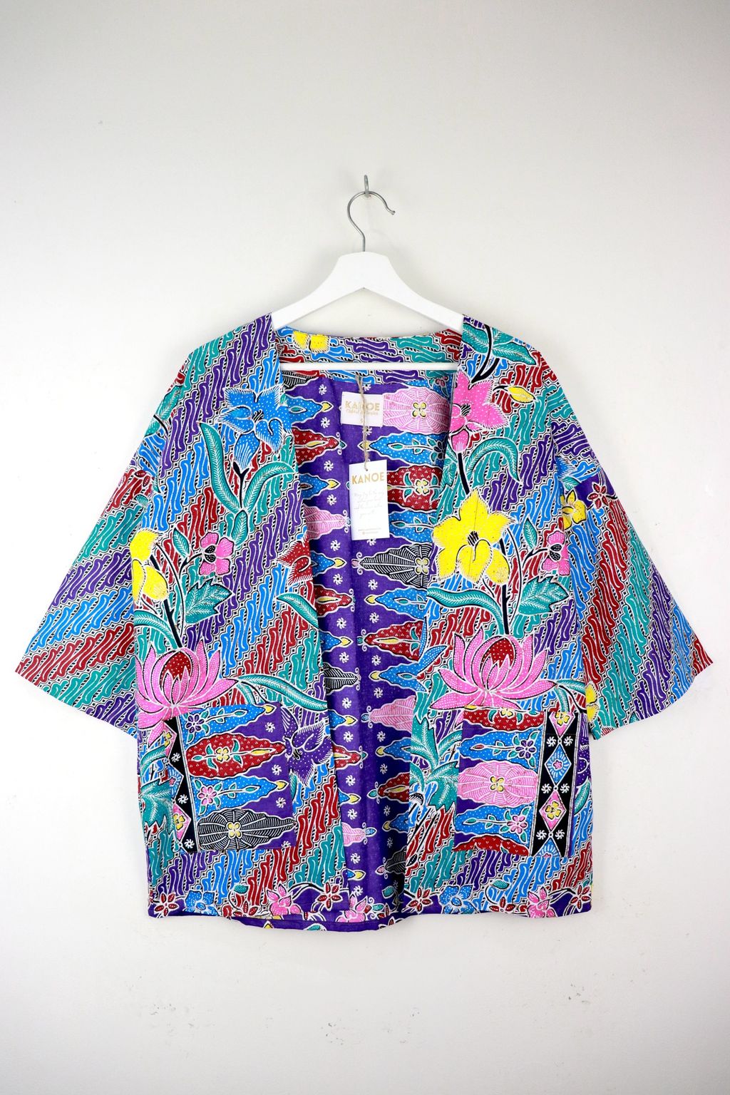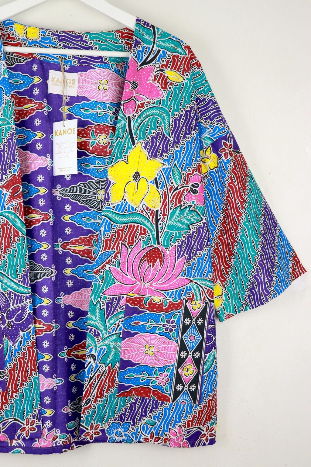 When we are stuck at home wearing a basic spaghetti strap top at home and the door bell rings, throw on this kimono before heading out to collect that parcel. Or if your boss calls you last minute for a zoom call. Throw on this batik kimono!