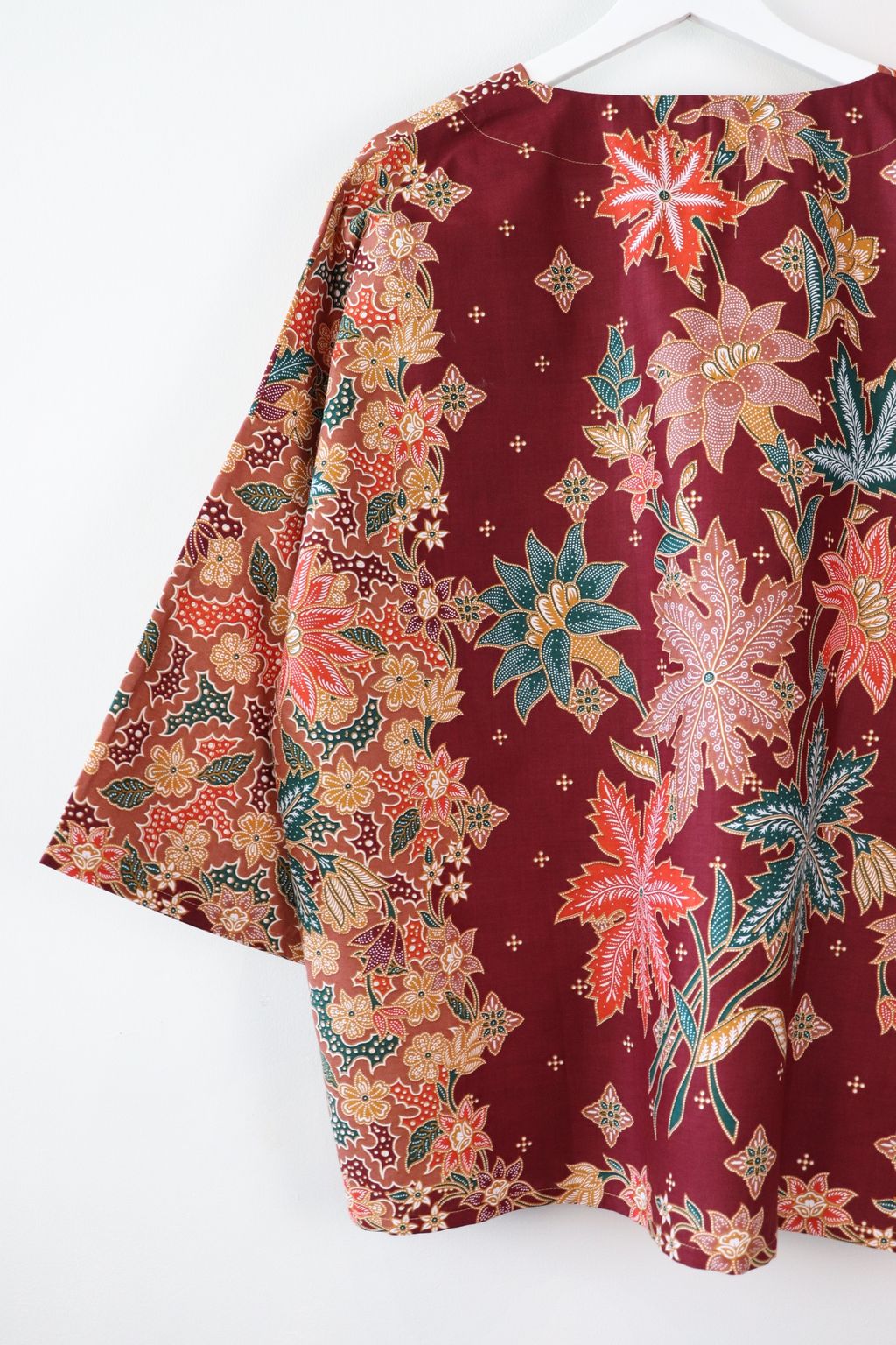 Our batik kimono worn over your basics will add that beautiful Indo-Malayan cultural touch that reminds you of your heritage or just to appreciate the art of our region. Keeps you feeling comfortable while indoors and great for those chilly rainy days. Definitely a piece for you to wear throughout the seasons. Made of 100% cotton, they are breathable and cooling, yet keeping you warm enough for comfort while indoors in the air conditioning.
