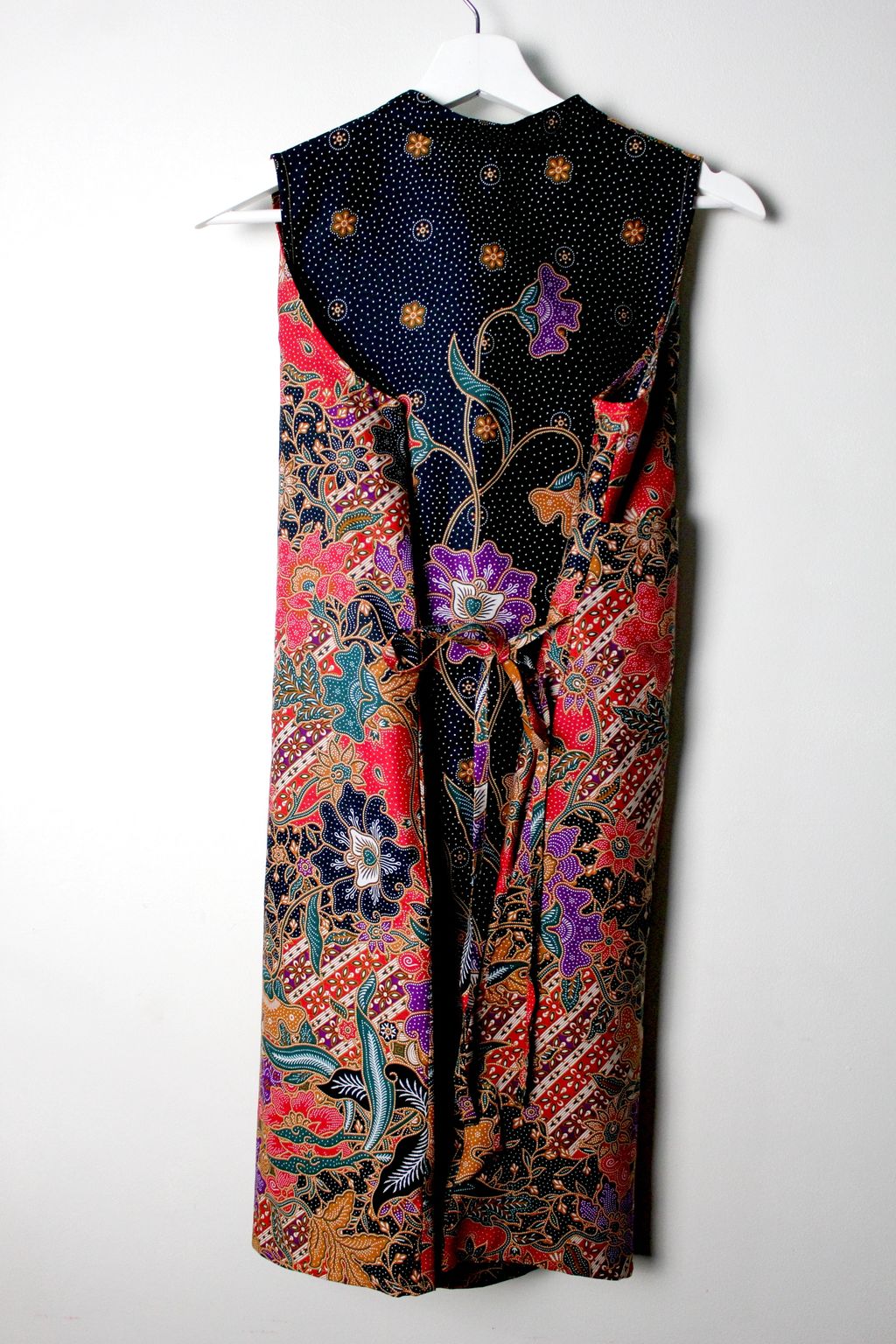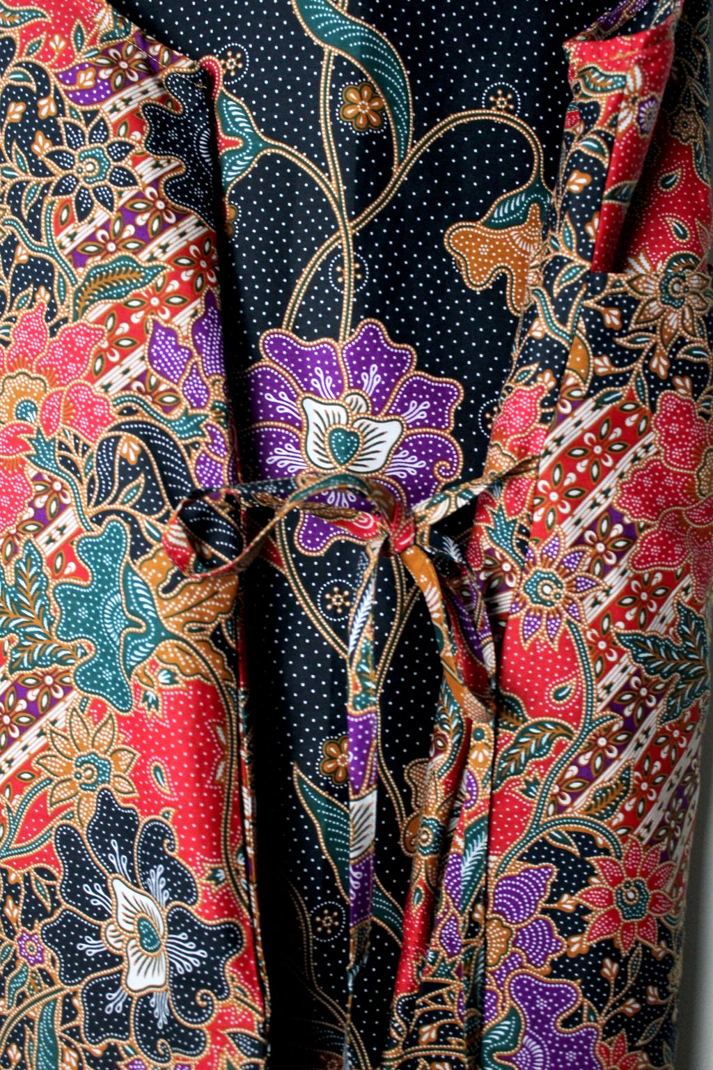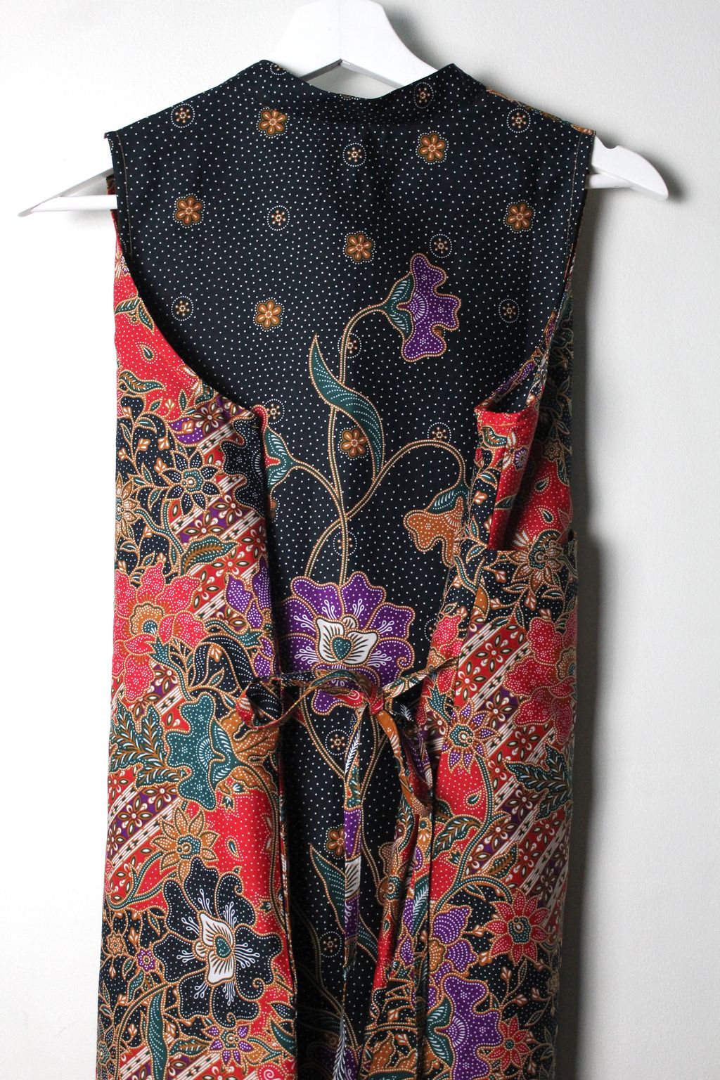 Made of 100% Cotton Batik. With pockets on both size and a waist ribbon that can be tied either front or back to give a fitted look !