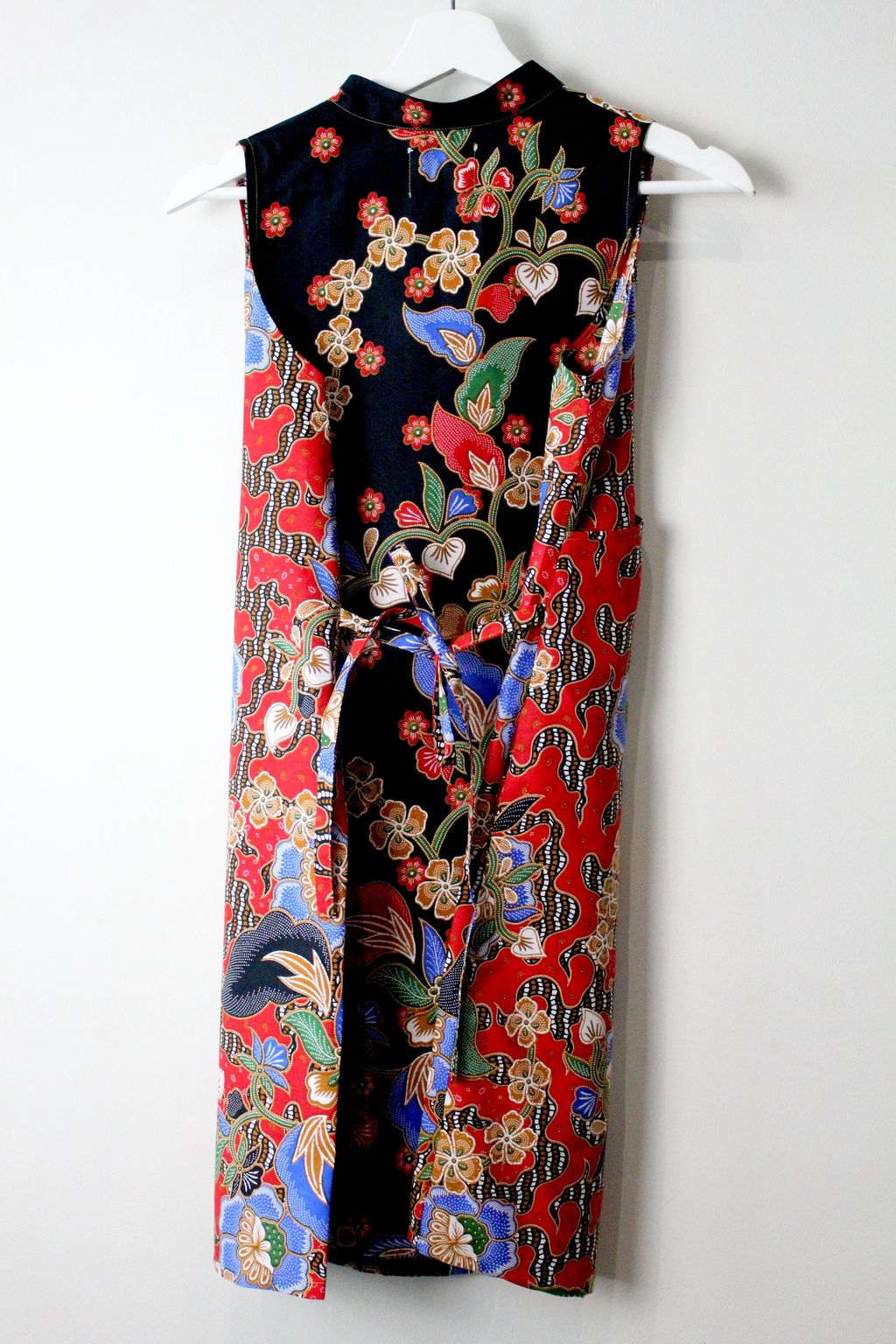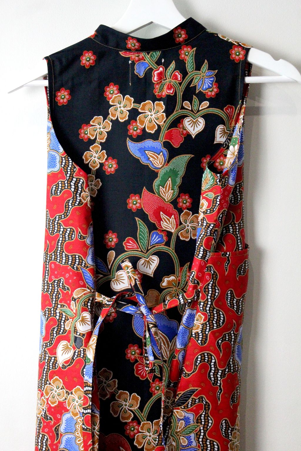 Made of 100% Cotton Batik. With pockets on both size and a waist ribbon that can be tied either front or back to give a fitted look !