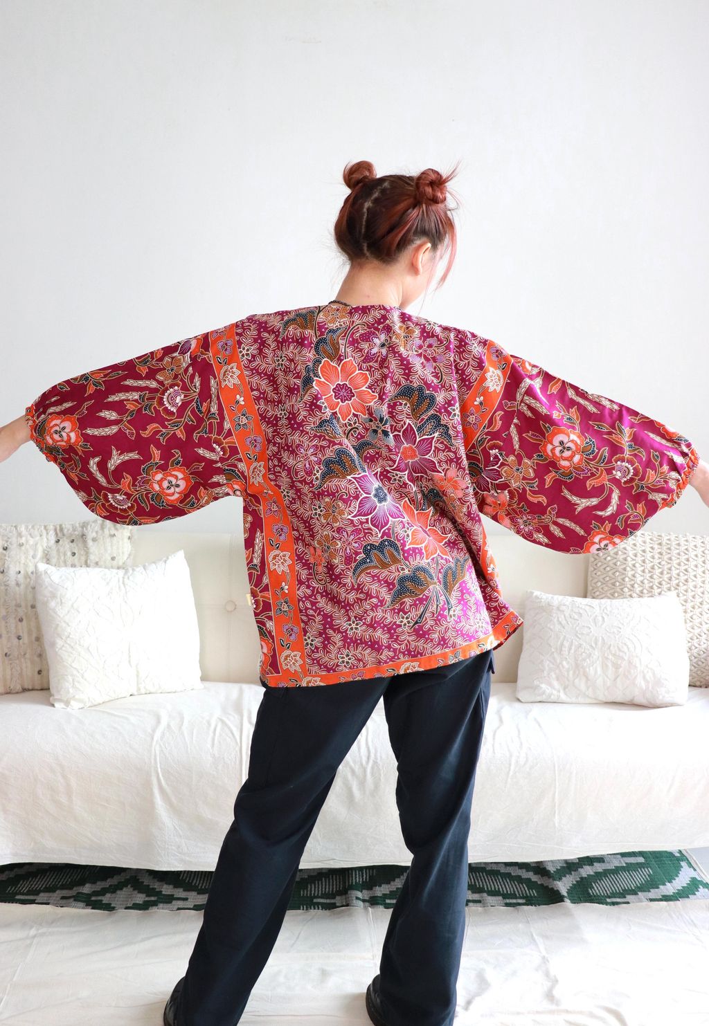 Our batik kimono can be worn over your basics adding that beautiful Indo-Malayan cultural touch that reminds you of your heritage or just to appreciate the art of our region. Keeps you feeling comfortable while indoors and great for those chilly rainy days. Definitely a piece for you to wear throughout the seasons. Made of 100% cotton, they are breathable and cooling, yet keeping you warm enough for comfort while indoors in the air conditioning.