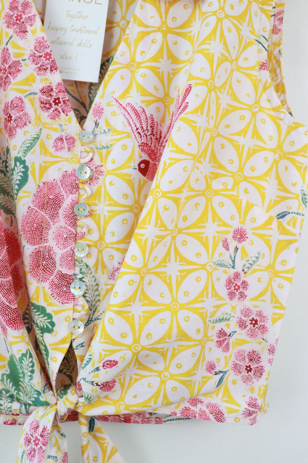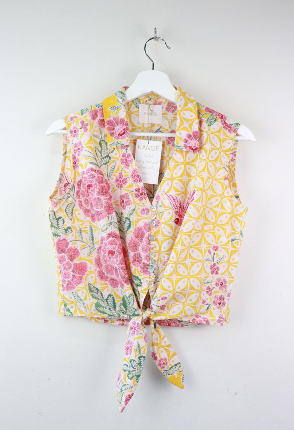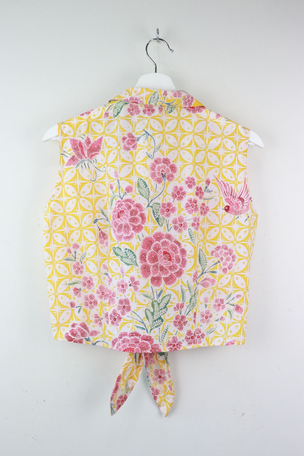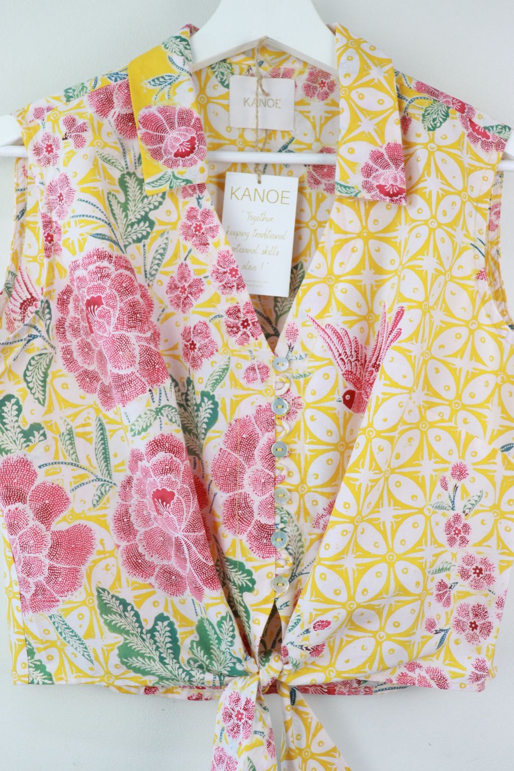 These pastel sleeveless front tie top are made from intricate hand stamped batik textile. Not one piece alike, you will love how beautiful the colours and print of this batik is made by skilled artisans of centuries of batik making wisdom. These batik come from a region where the batik makers have influence from Chinese and European merchants in which is on display in the motifs and colours of the batik.