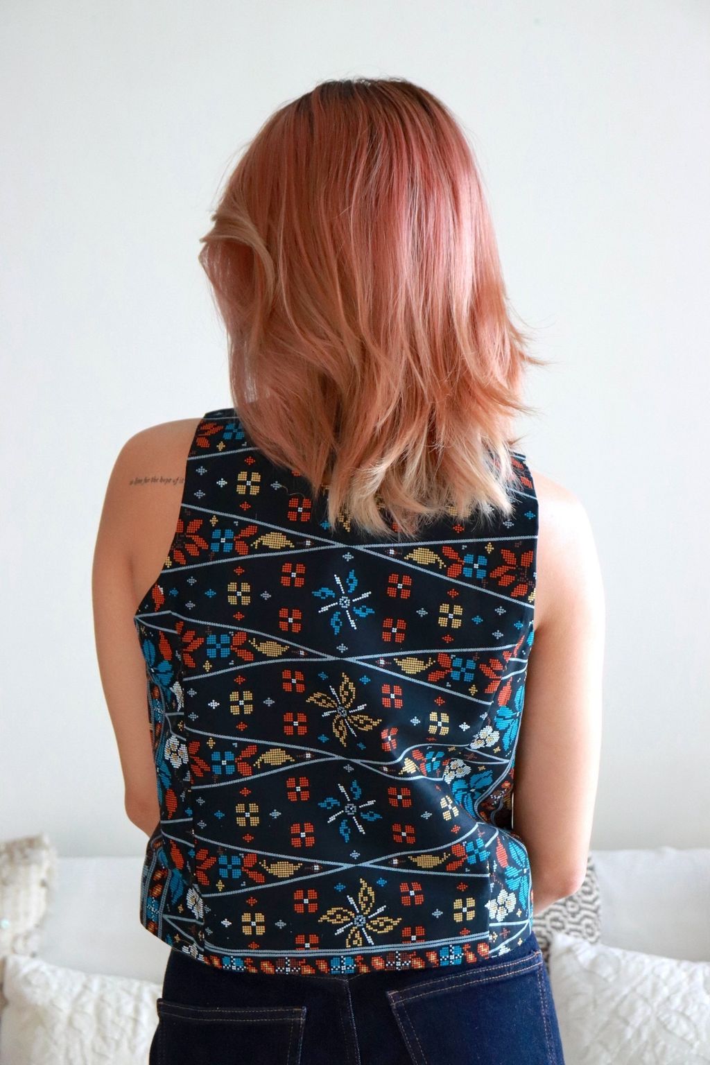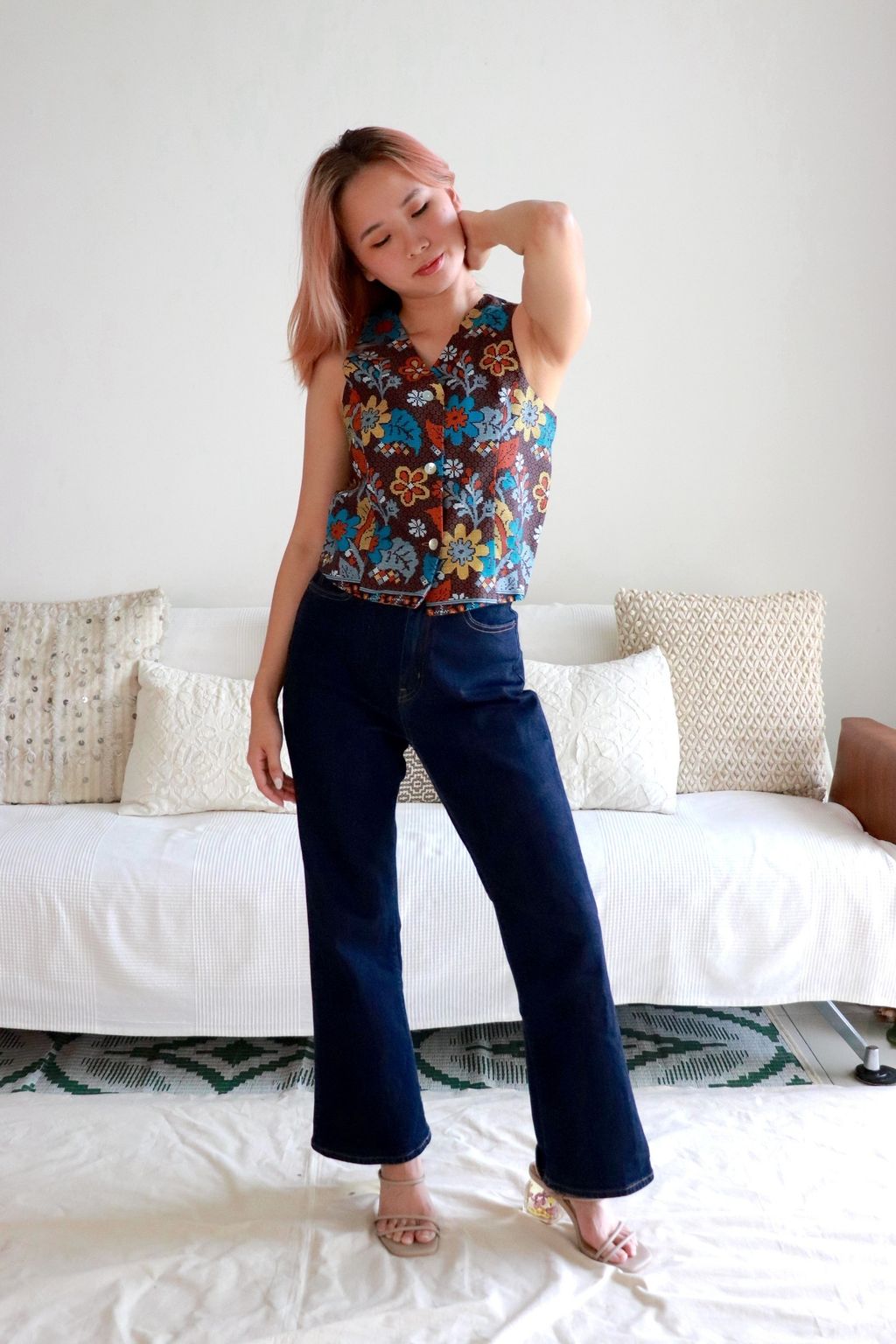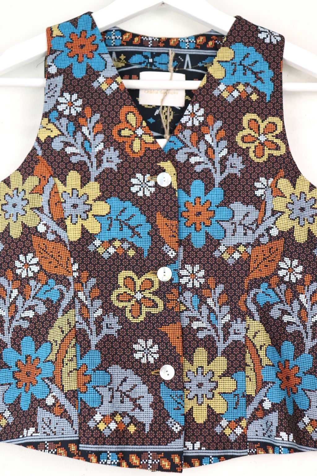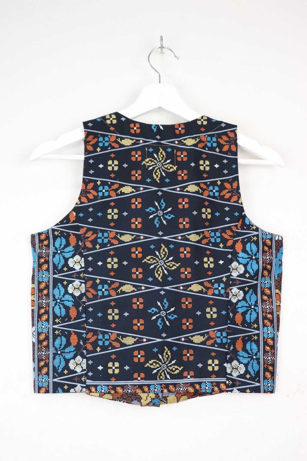 Having batik in the classic vest cut with mother of pearl buttons running through the centre front, this definitely is a statement piece of batik fun with that bit of tailored structure holding it up to becoming an ultimate dream piece.