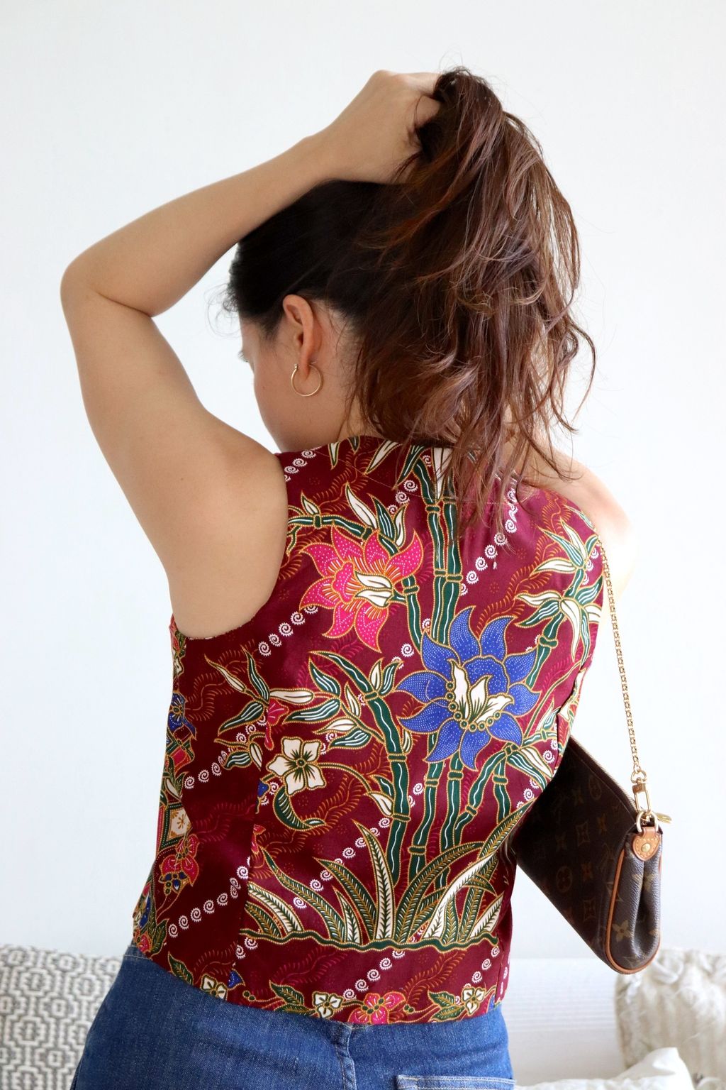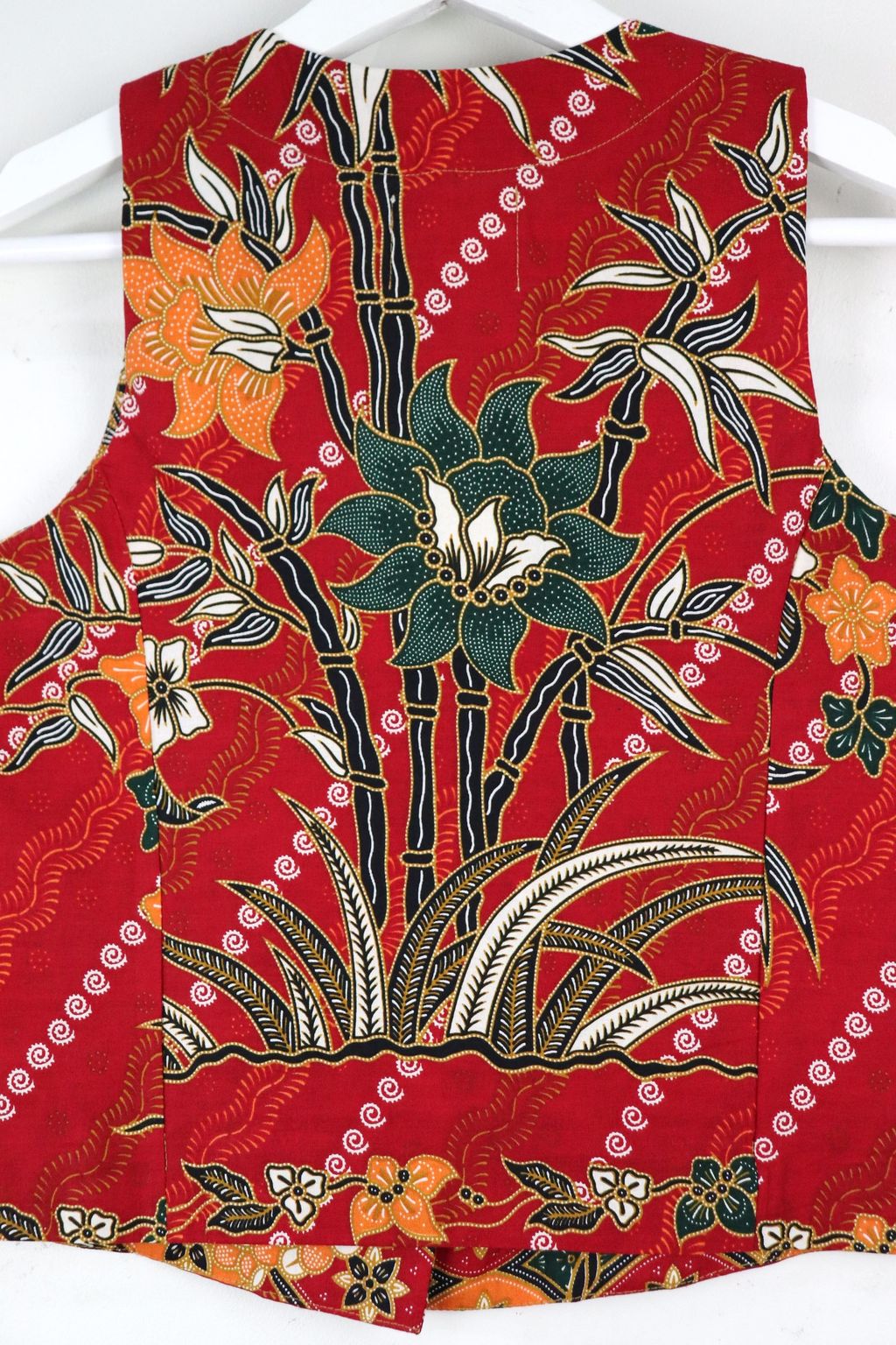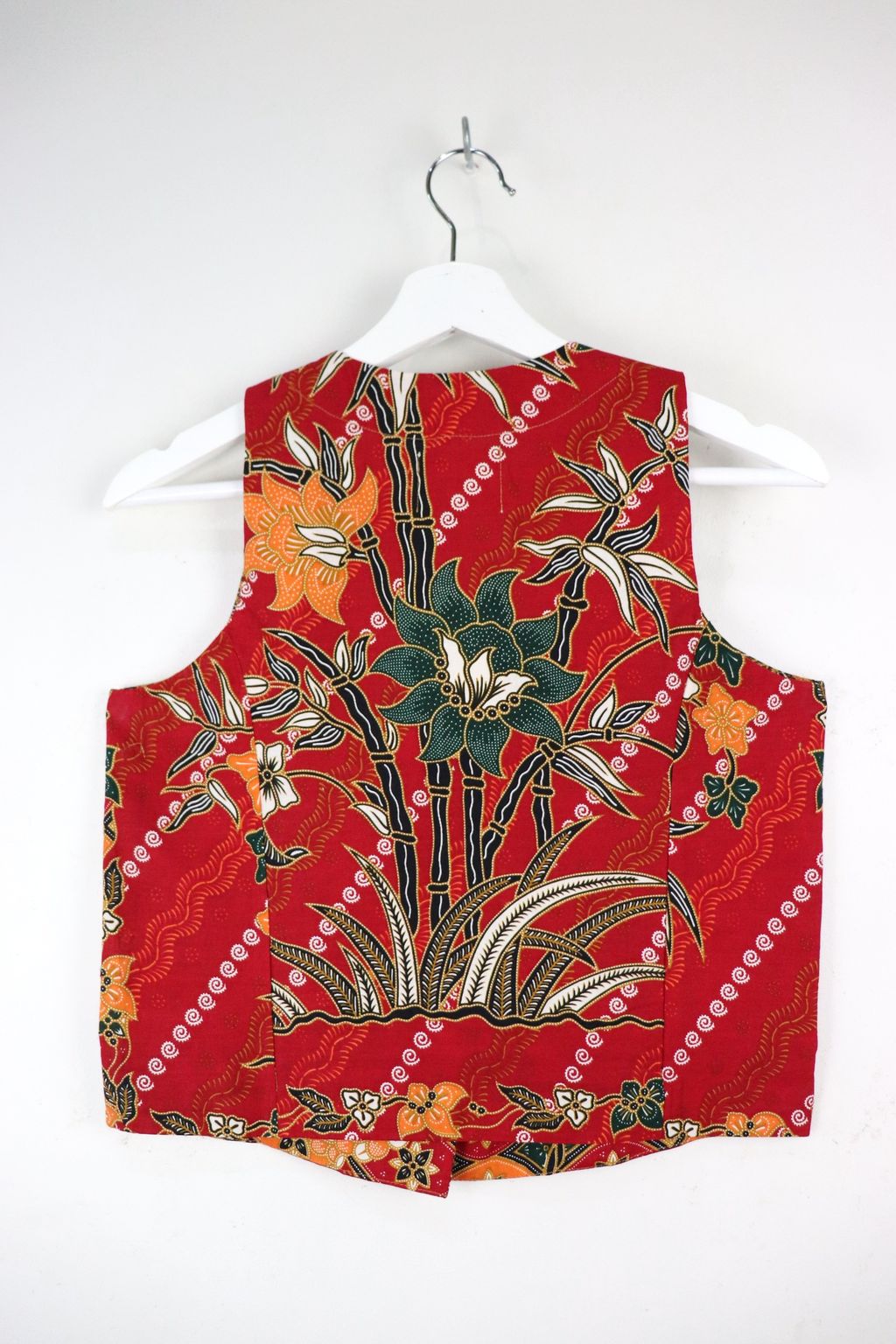 Having batik in the classic vest cut with mother of pearl buttons running through the centre front, this definitely is a statement piece of batik fun with that bit of tailored structure holding it up to becoming an ultimate dream piece.