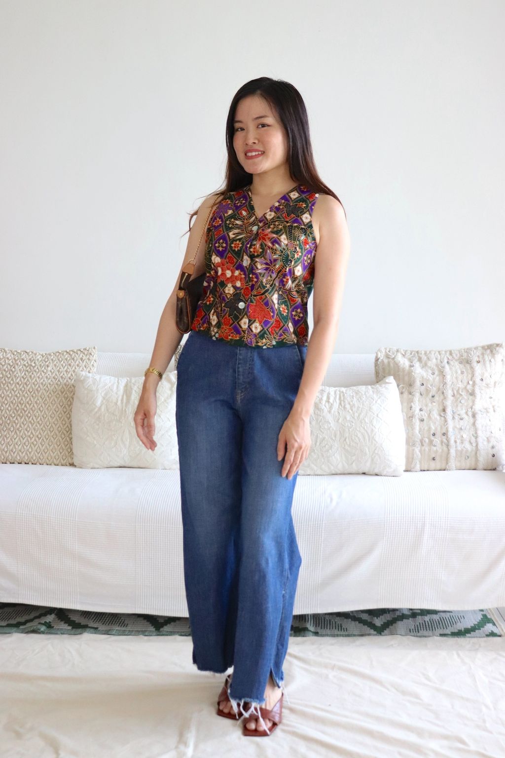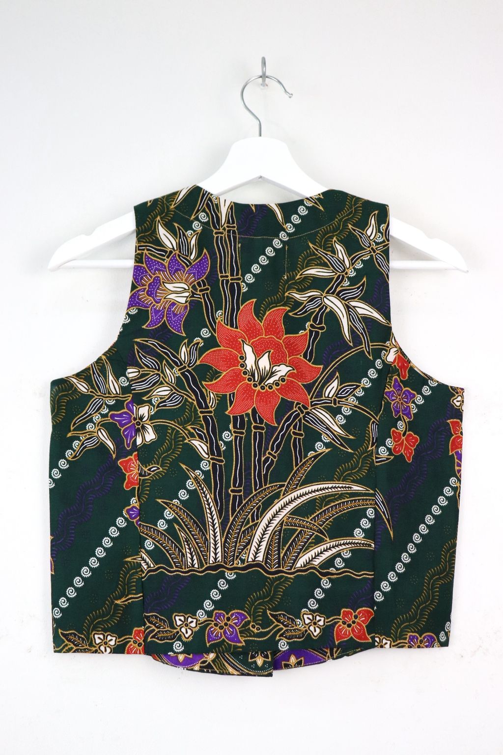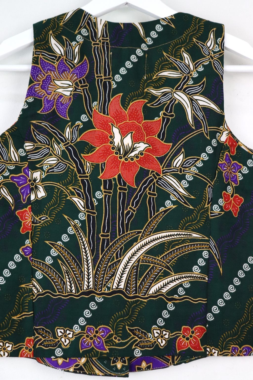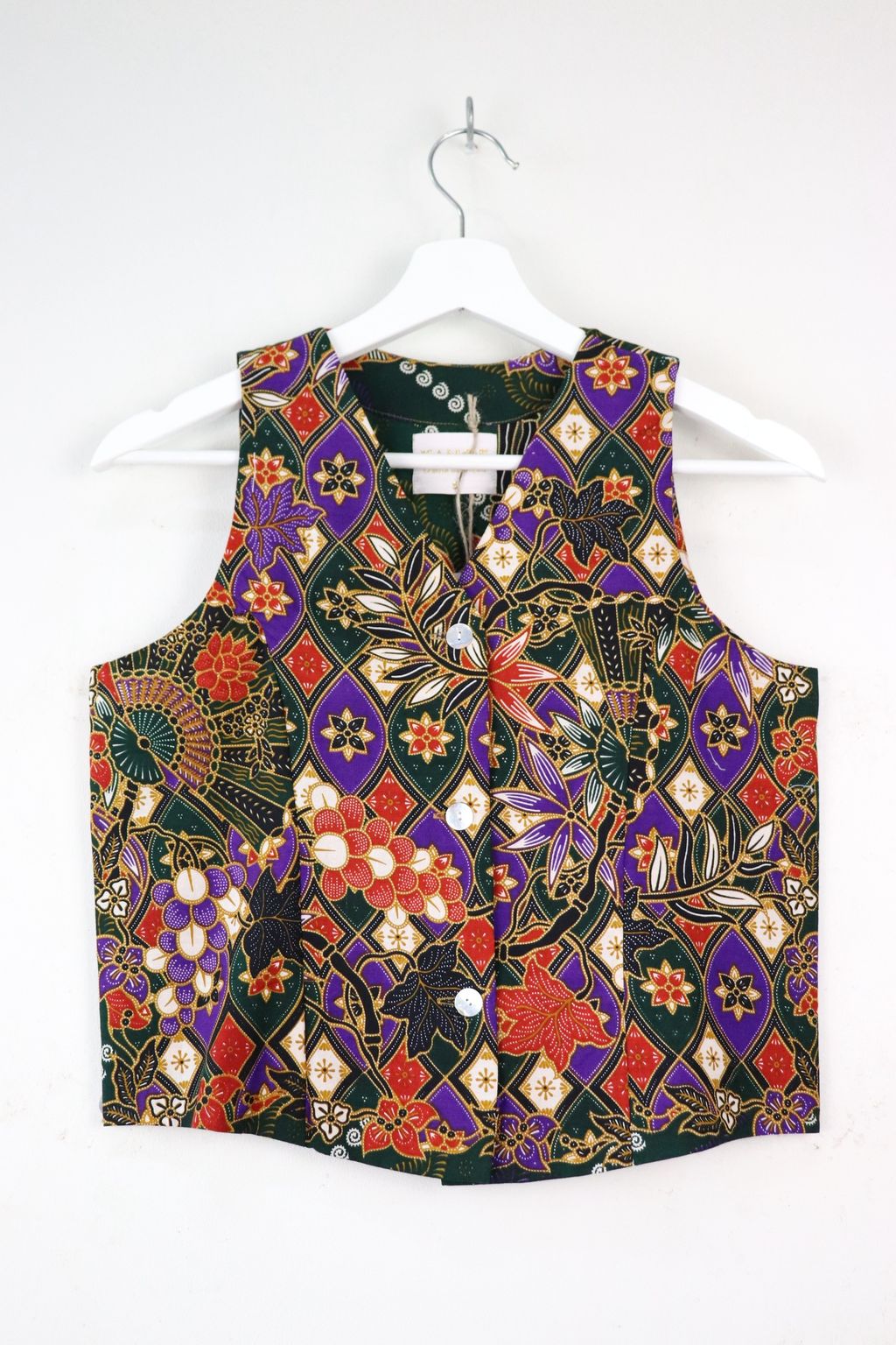 Having batik in the classic vest cut with mother of pearl buttons running through the centre front, this definitely is a statement piece of batik fun with that bit of tailored structure holding it up to becoming an ultimate dream piece.