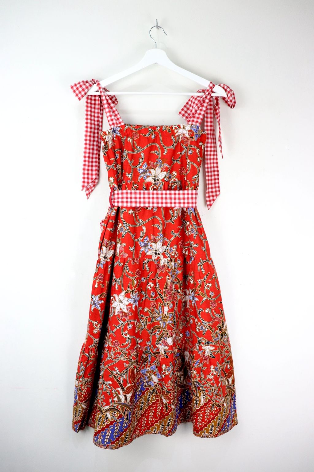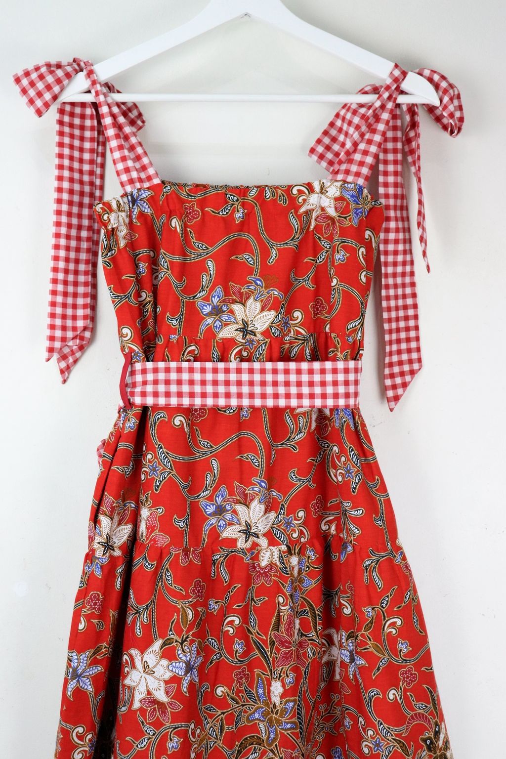 Adorned with red and white gingham ribbon straps and a coordinating belt!