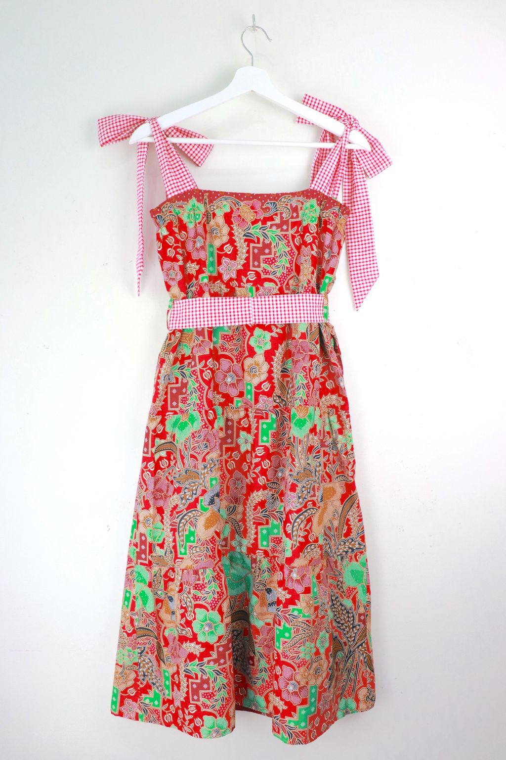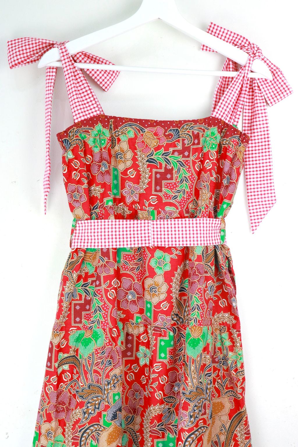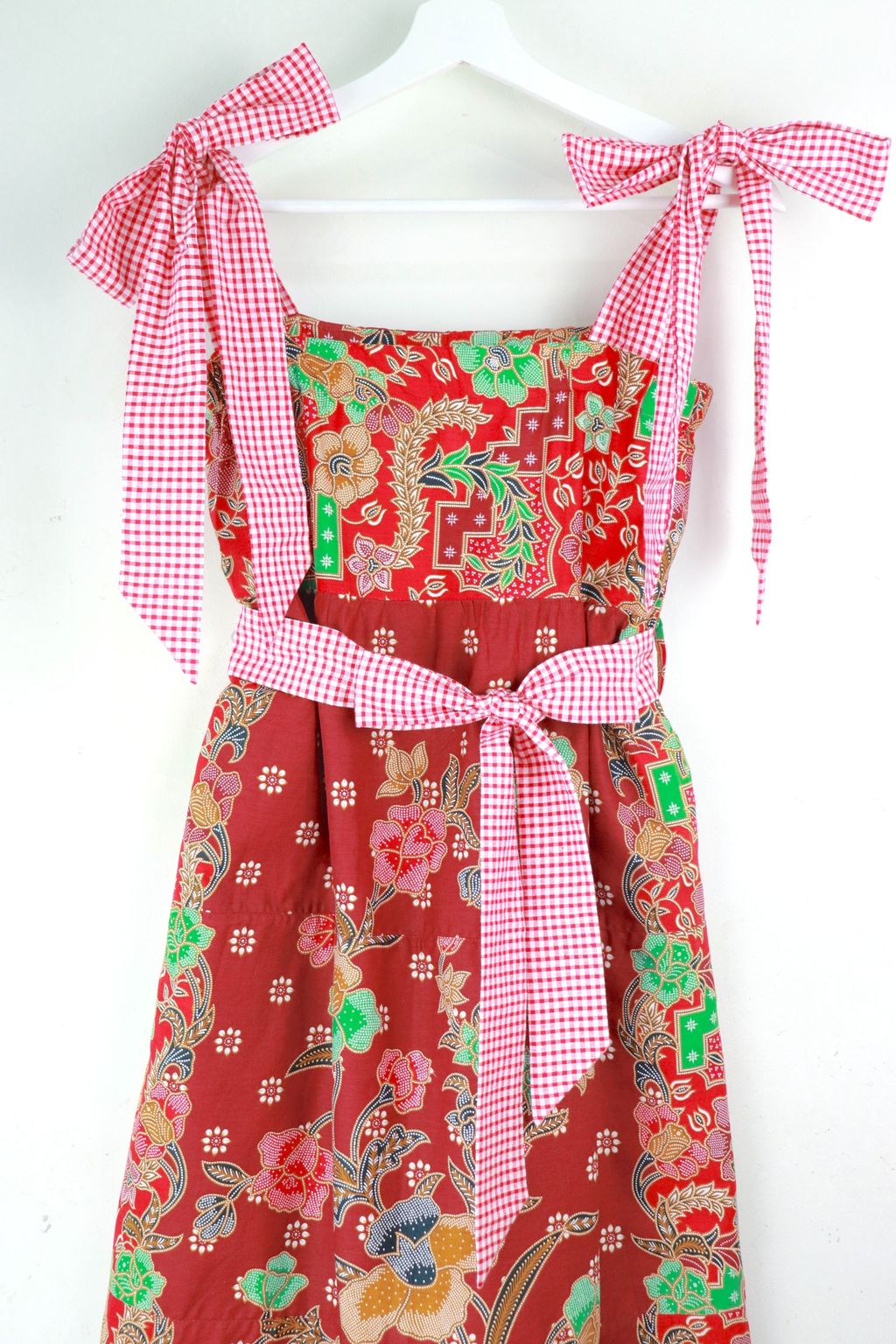 Adorned with red and white gingham ribbon straps and a coordinating belt!