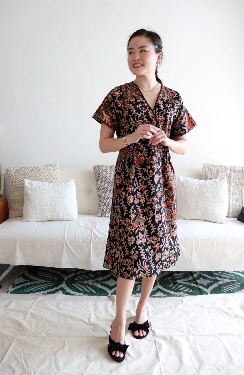 Also perfect if you are preggers or are breastfeeding! The wrap V-neck bodice allows for a nice fit over the bust and allows for easy breastfeeding.