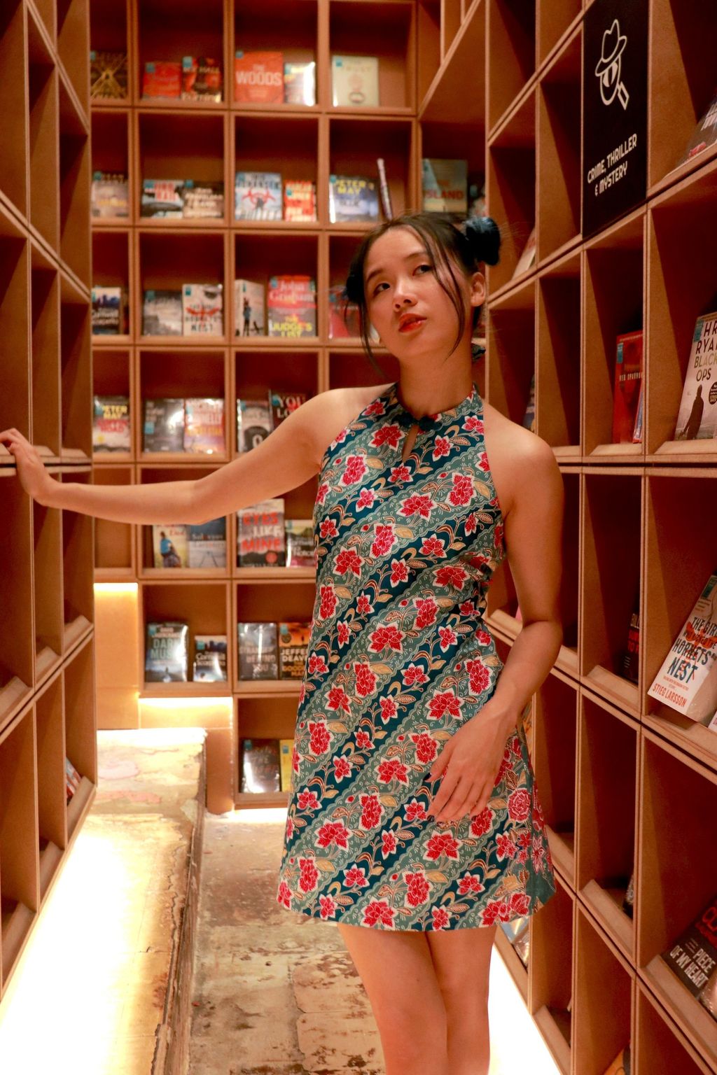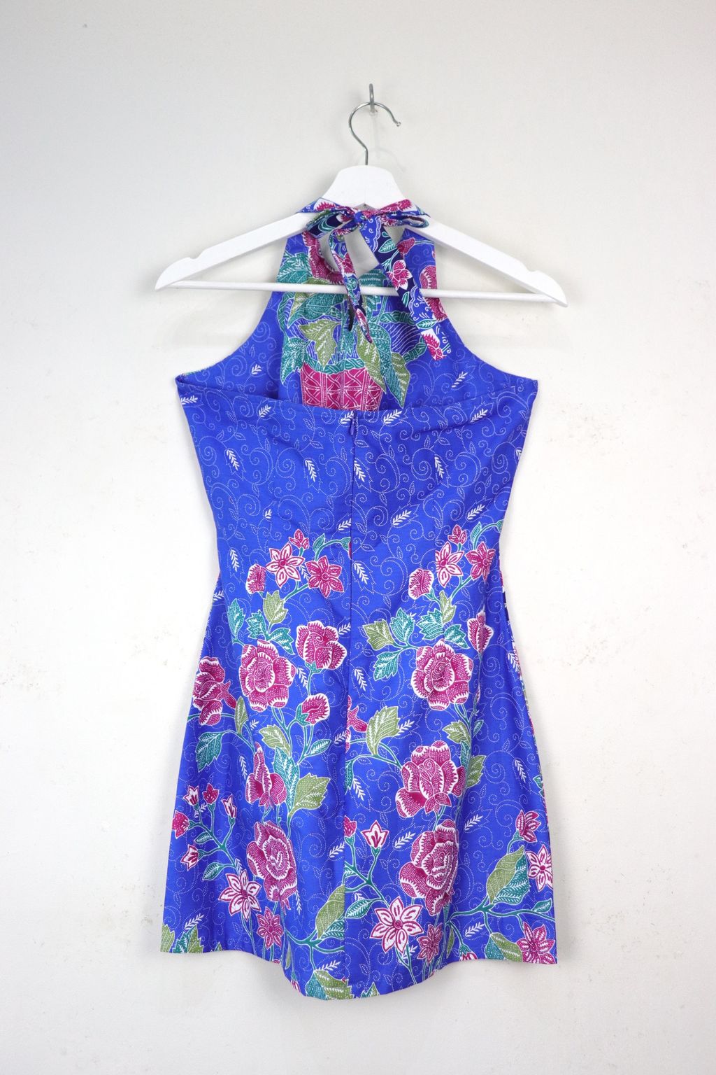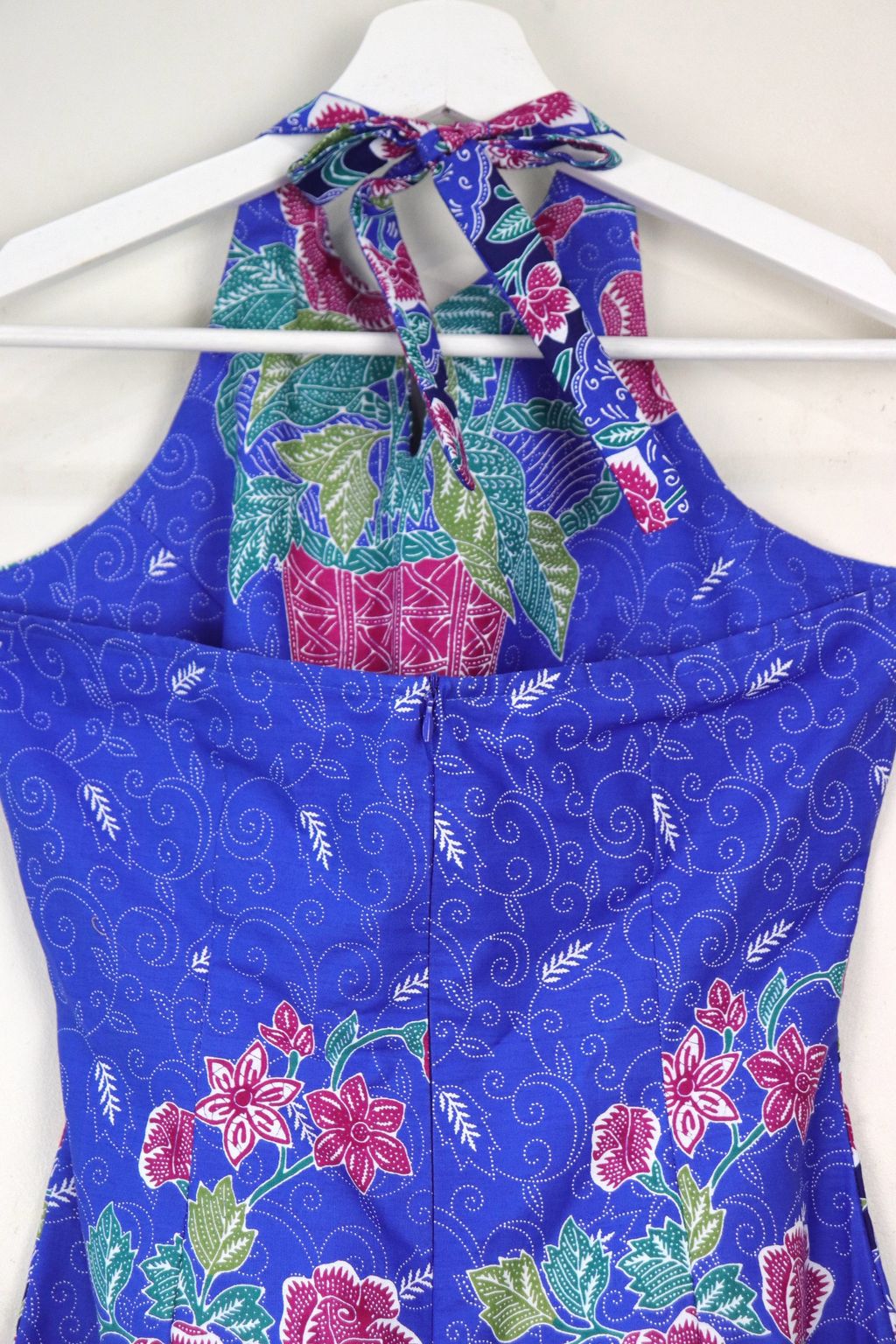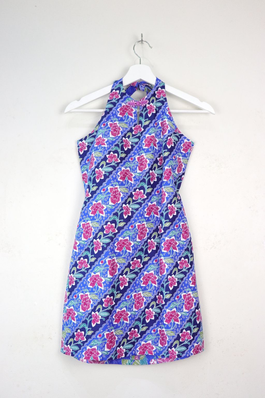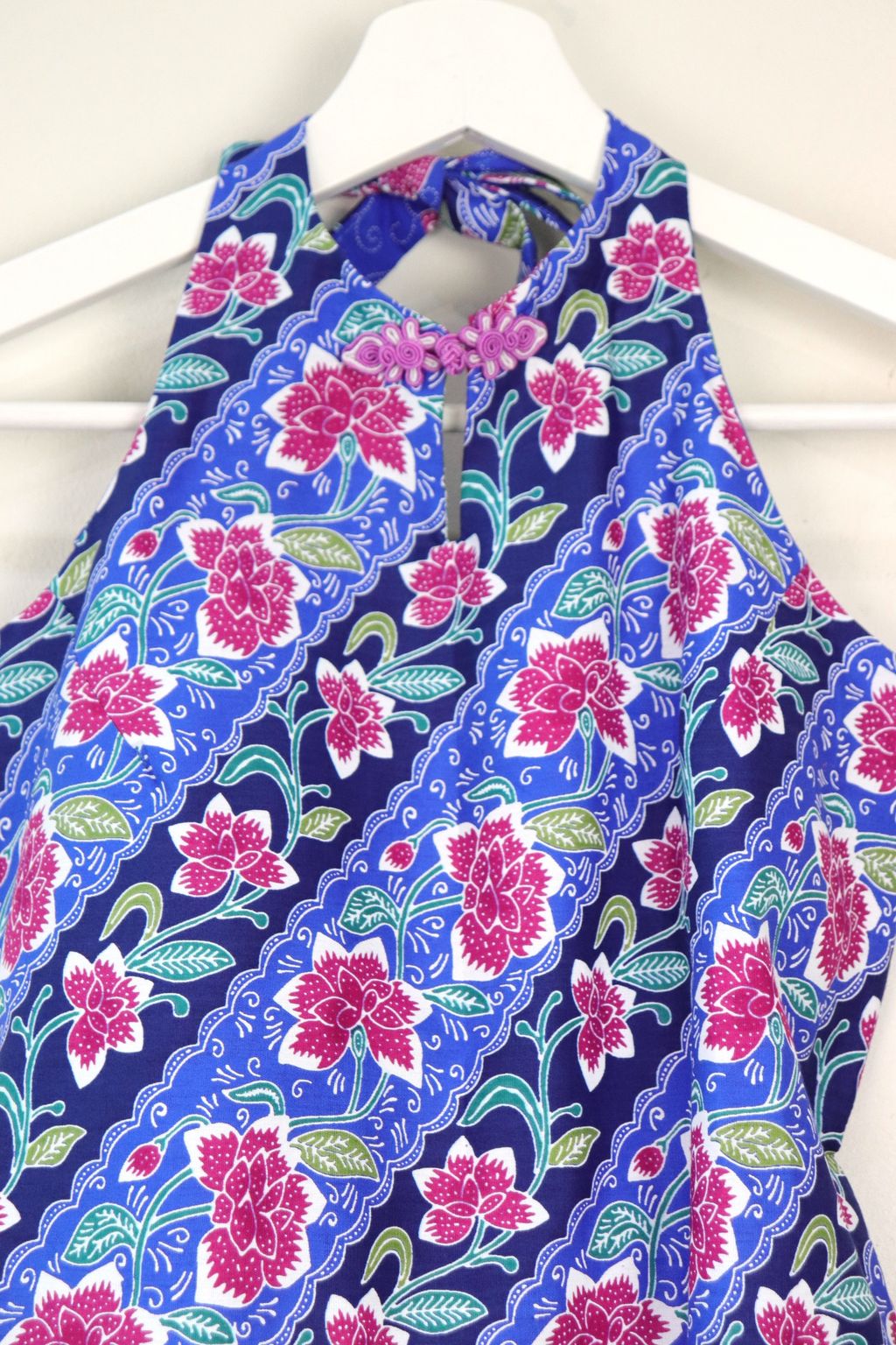 These super cute halter batik dresses feature a chinese clasp button above the keyhole cutout!