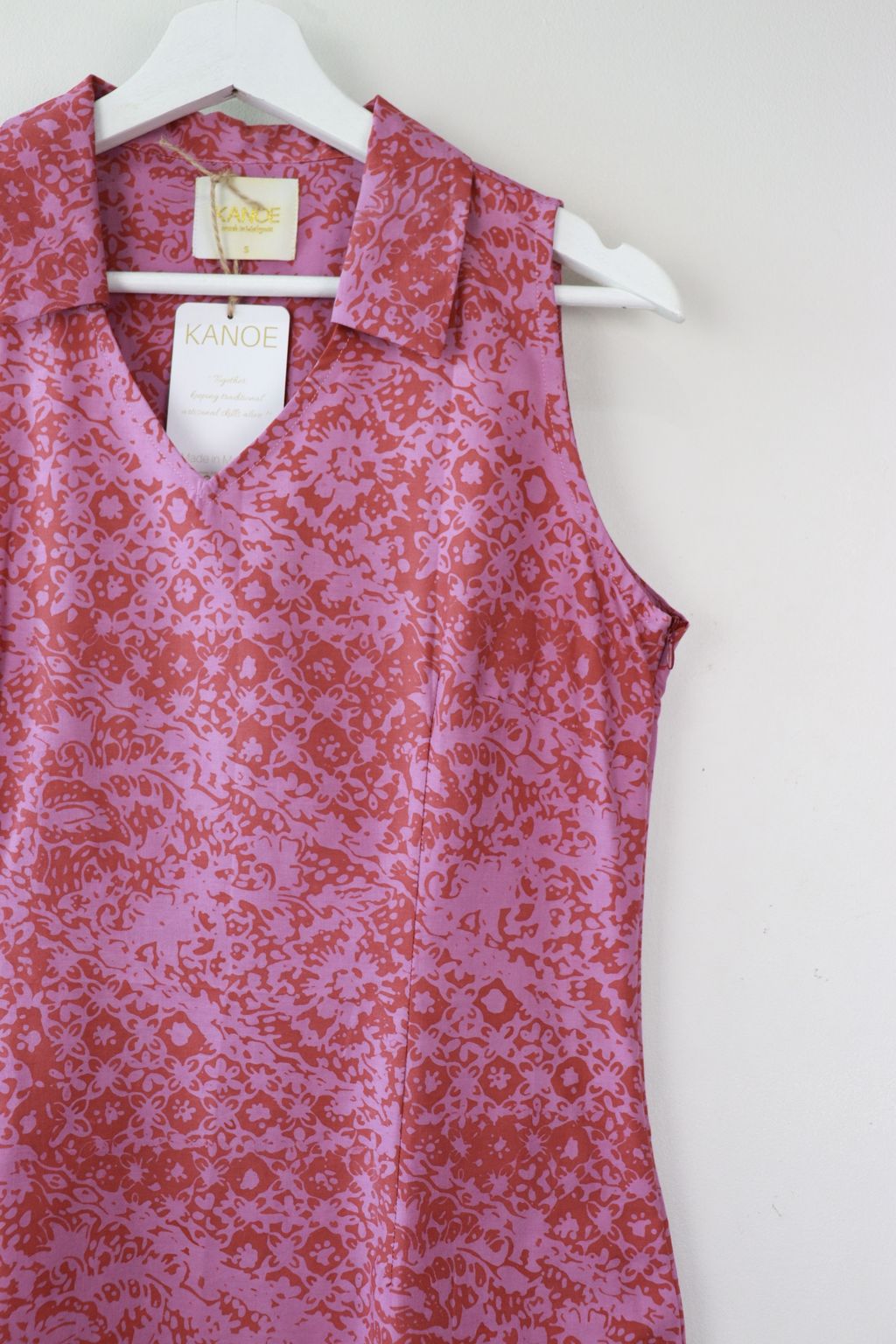 These classic collared v-neck sleeveless tops made in gorgeous local handmade batik. Created by our own artisans here in the tropics of Malaysia. 100% Cotton, unique one of a kind batik hand printed in swirls of pastel shades.