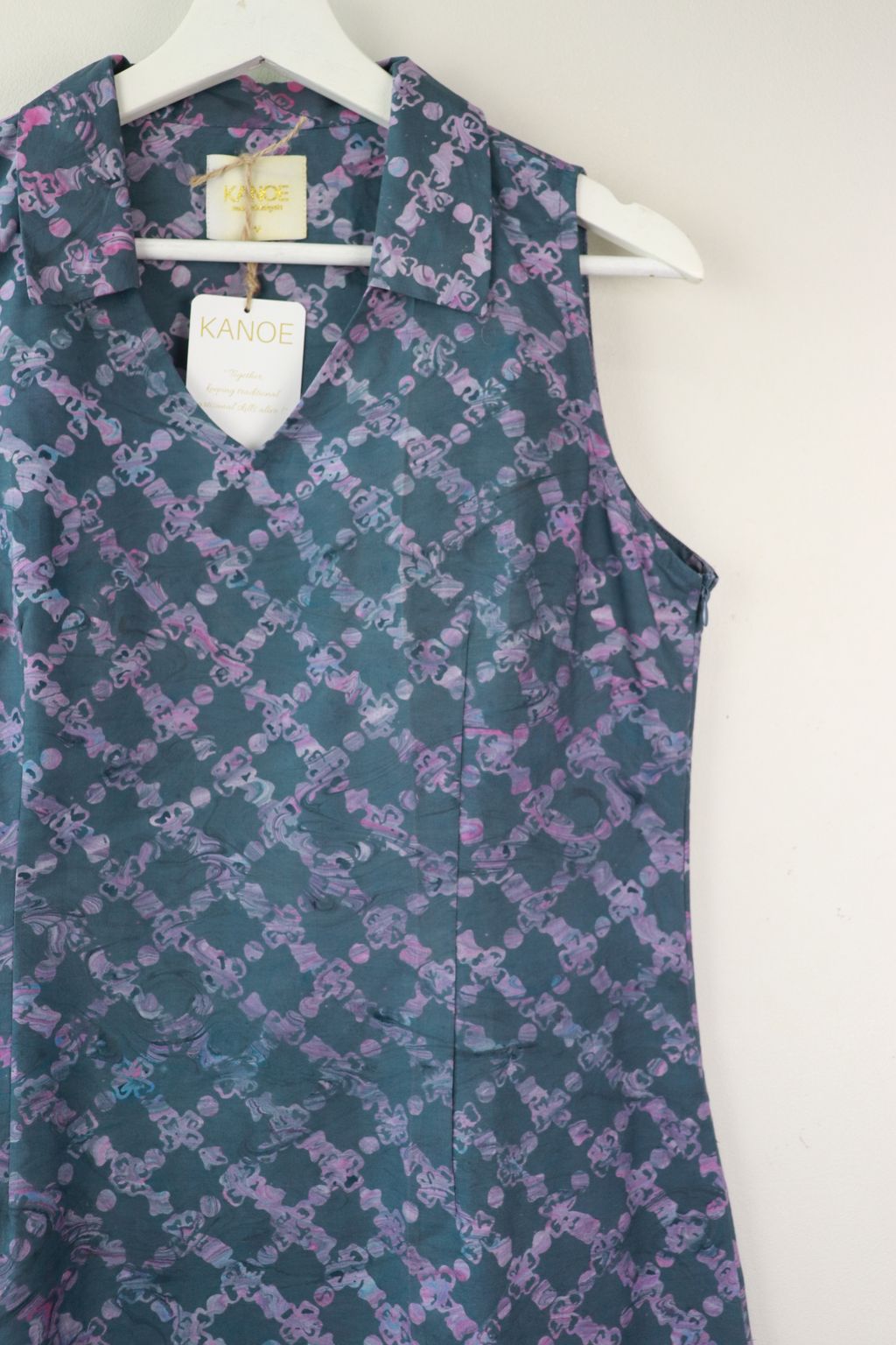 These classic collared v-neck sleeveless tops made in gorgeous local handmade batik. Created by our own artisans here in the tropics of Malaysia. 100% Cotton, unique one of a kind batik hand printed in swirls of pastel shades.