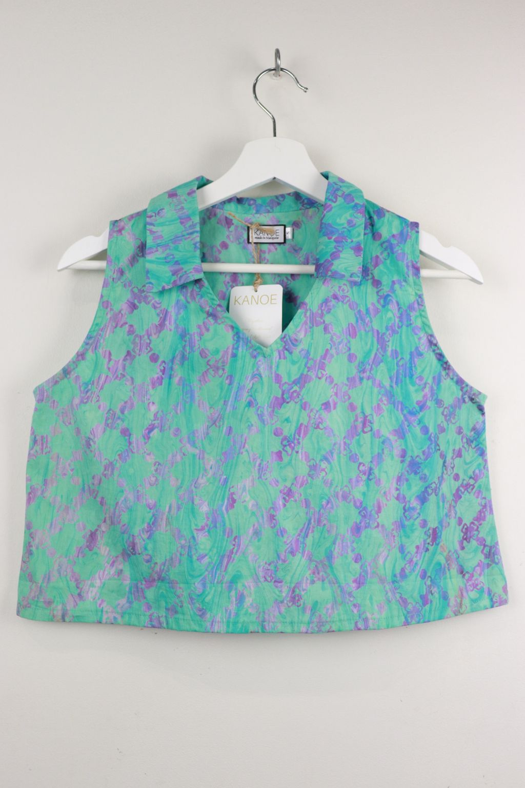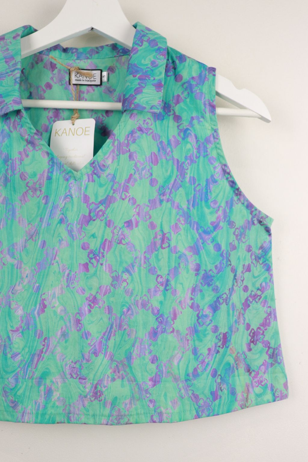 These classic collared v-neck sleeveless tops made in gorgeous local handmade batik. Created by our own artisans here in the tropics of Malaysia. 100% Cotton, unique one of a kind batik hand printed in swirls of pastel shades.
