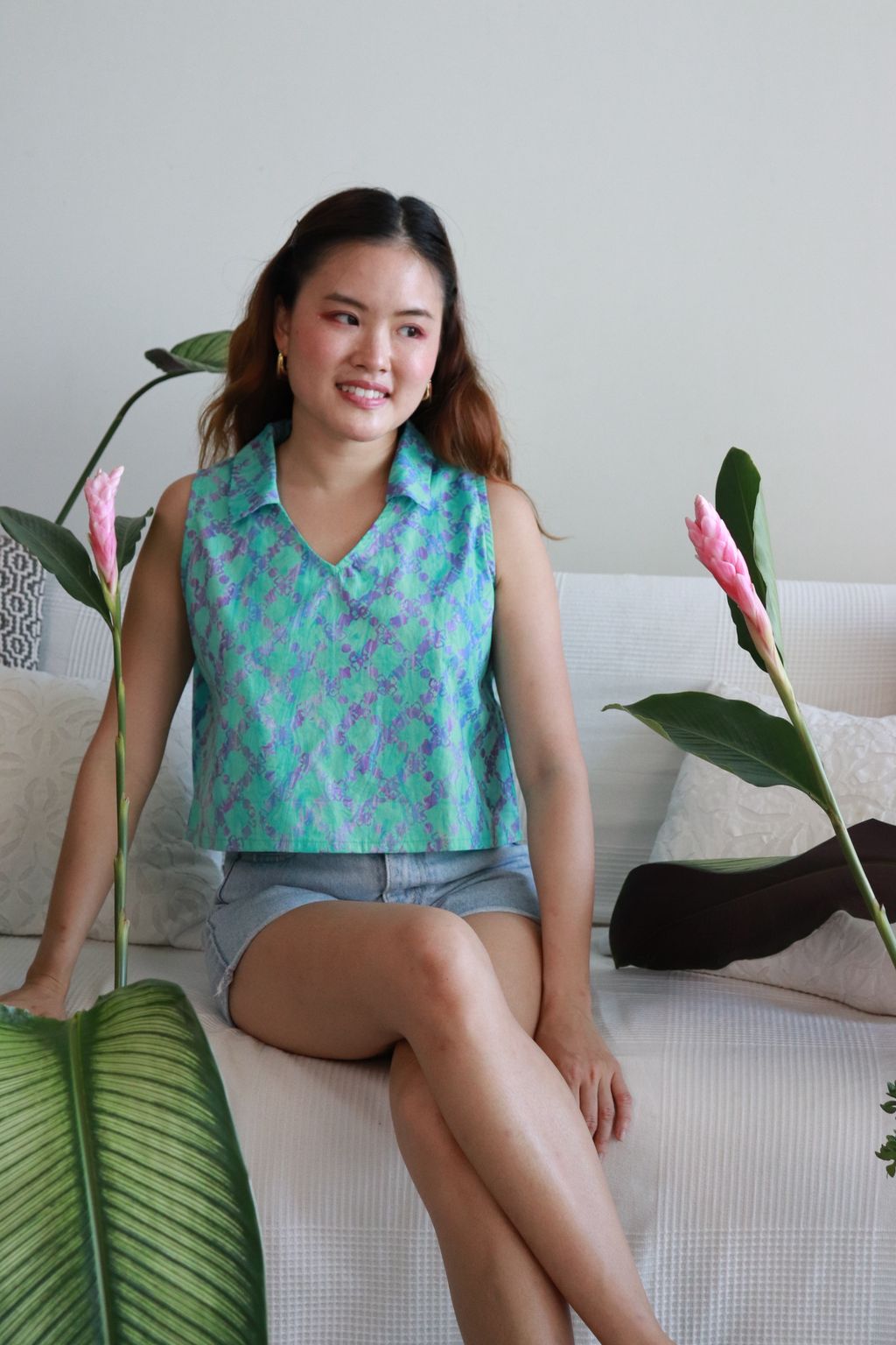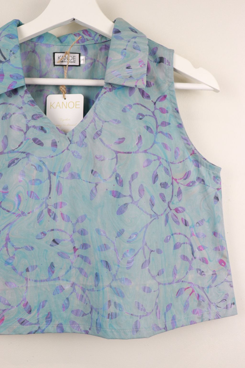 These classic collared v-neck sleeveless tops made in gorgeous local handmade batik. Created by our own artisans here in the tropics of Malaysia. 100% Cotton, unique one of a kind batik hand printed in swirls of pastel shades.
