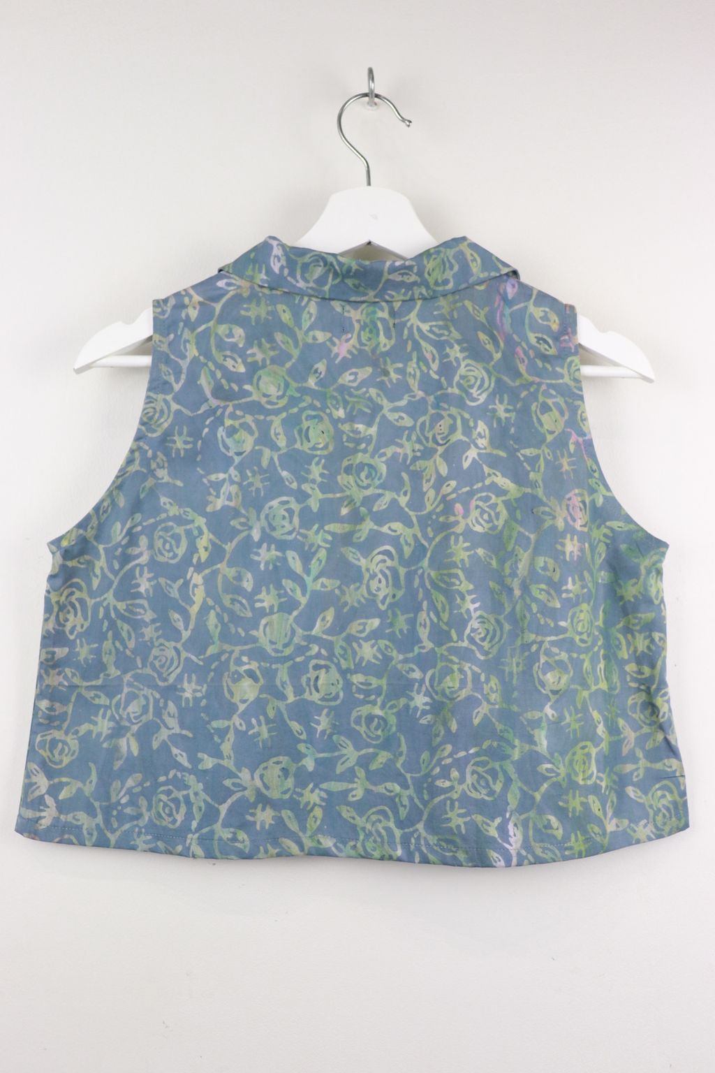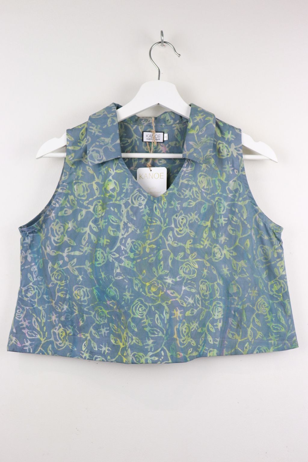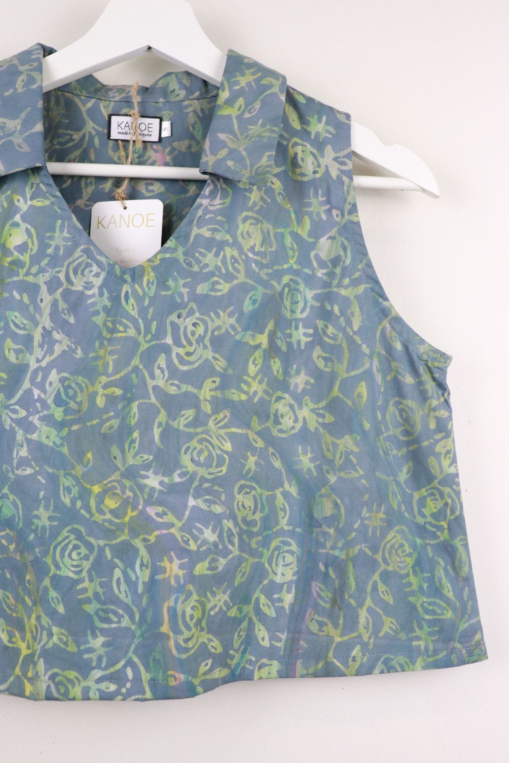 These classic collared v-neck sleeveless tops made in gorgeous local handmade batik. Created by our own artisans here in the tropics of Malaysia. 100% Cotton, unique one of a kind batik hand printed in swirls of pastel shades.