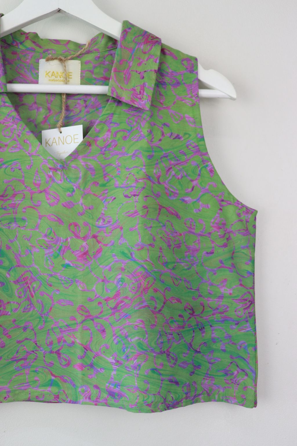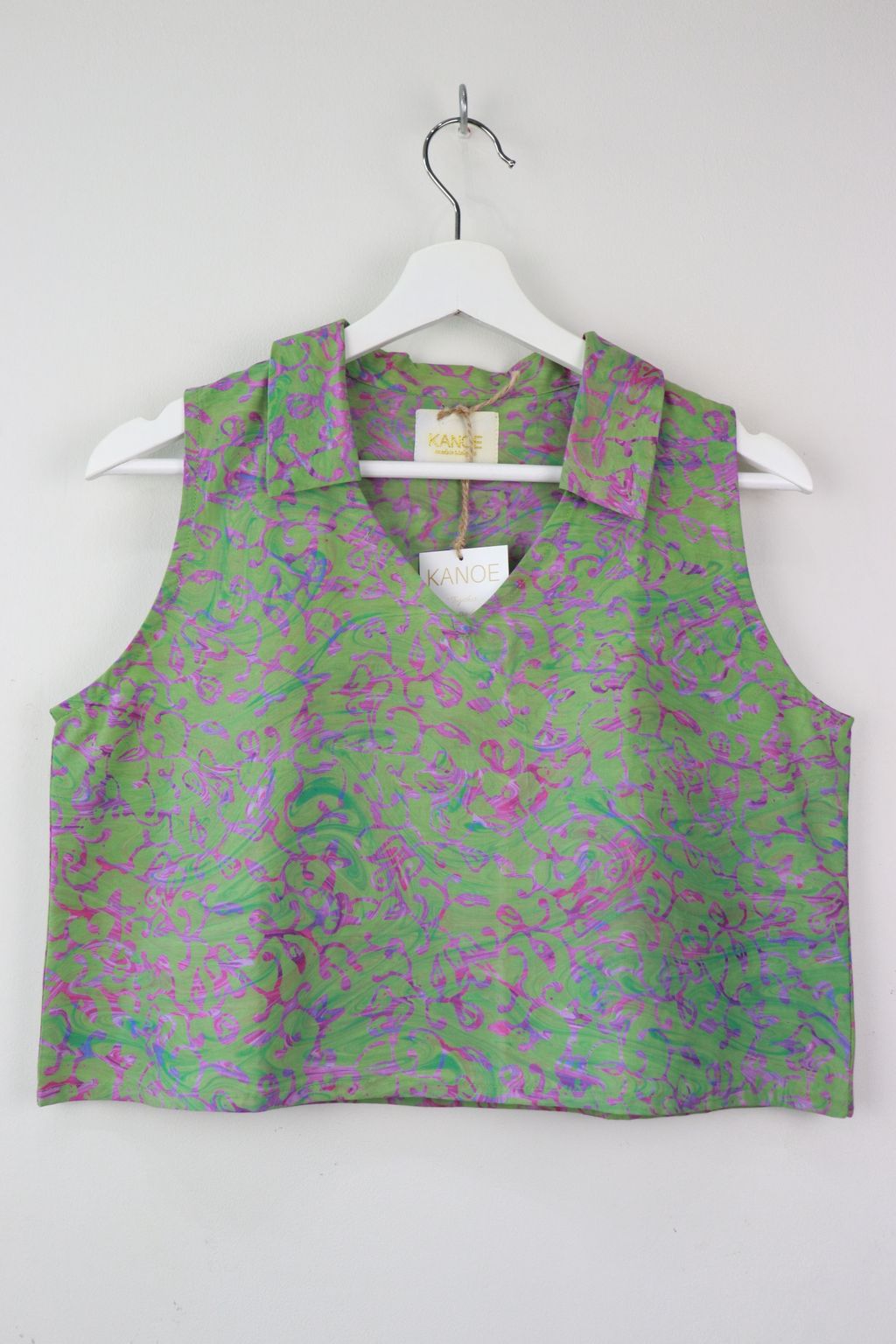 These classic collared v-neck sleeveless tops made in gorgeous local handmade batik. Created by our own artisans here in the tropics of Malaysia. 100% Cotton, unique one of a kind batik hand printed in swirls of pastel shades.