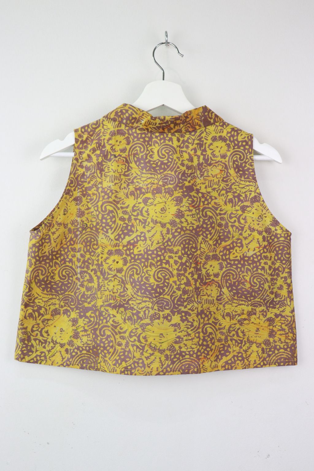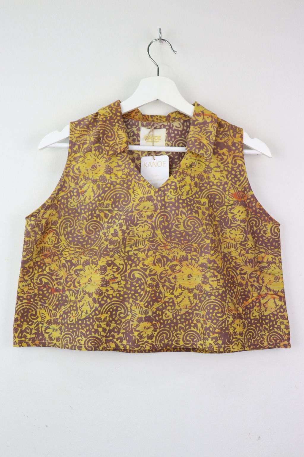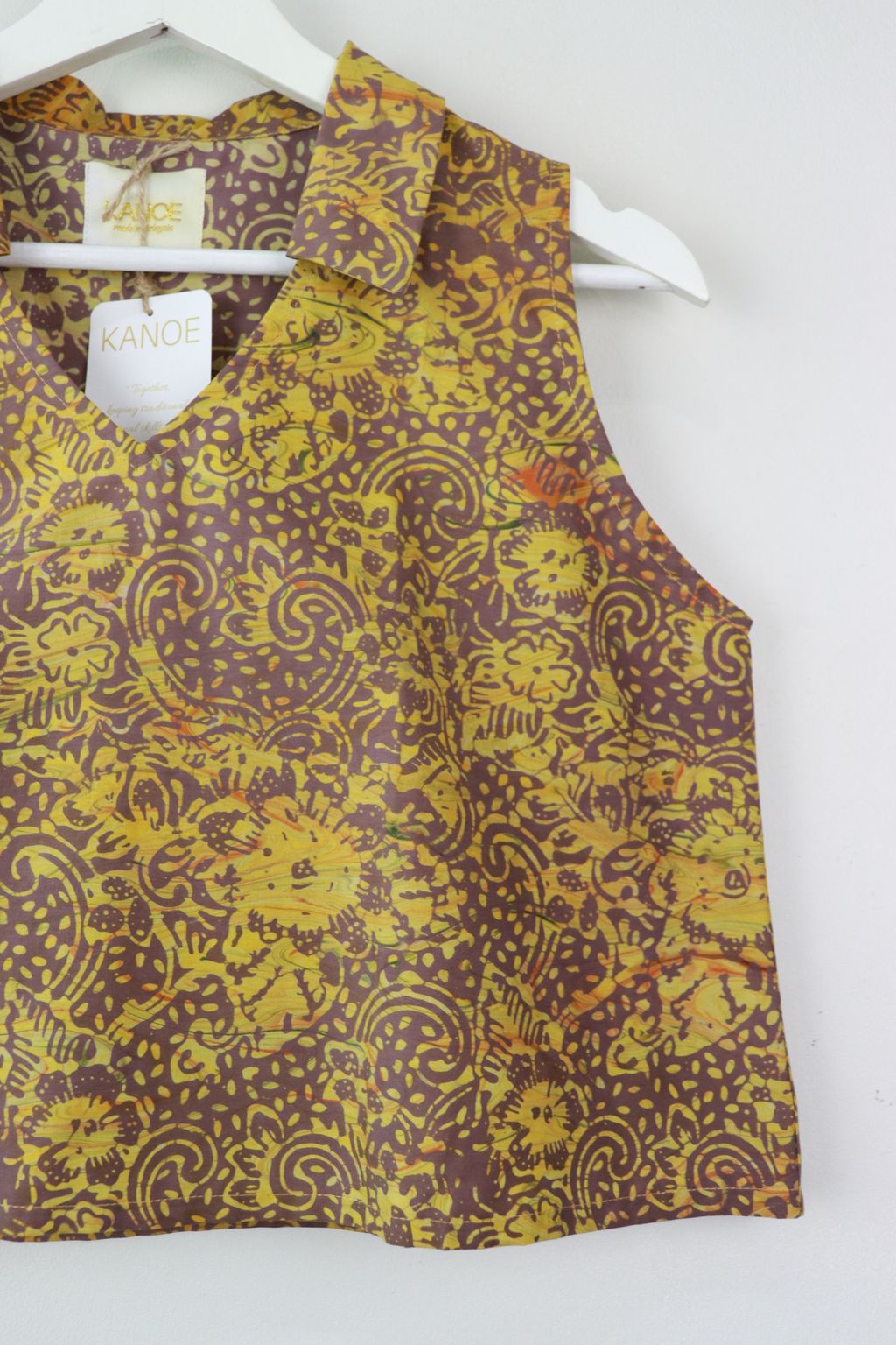 These classic collared v-neck sleeveless tops made in gorgeous local handmade batik. Created by our own artisans here in the tropics of Malaysia. 100% Cotton, unique one of a kind batik hand printed in swirls of pastel shades.