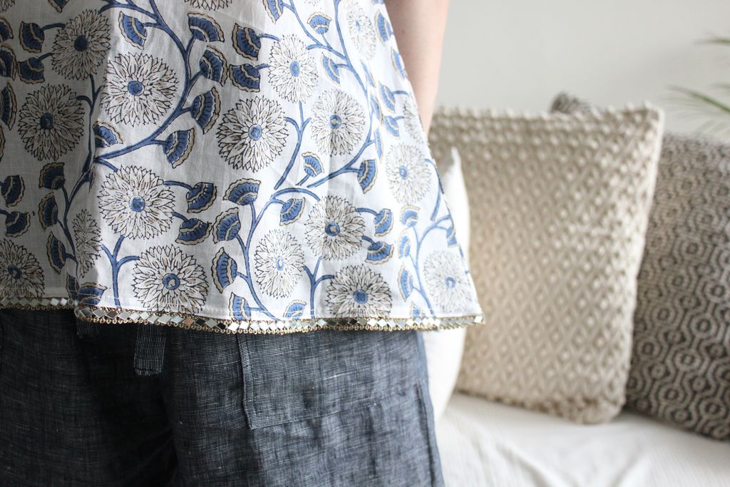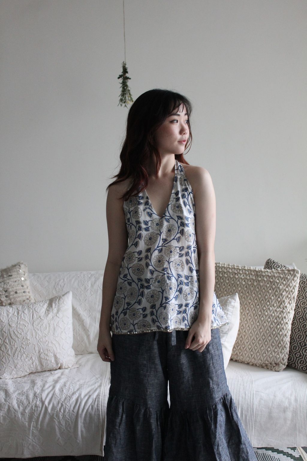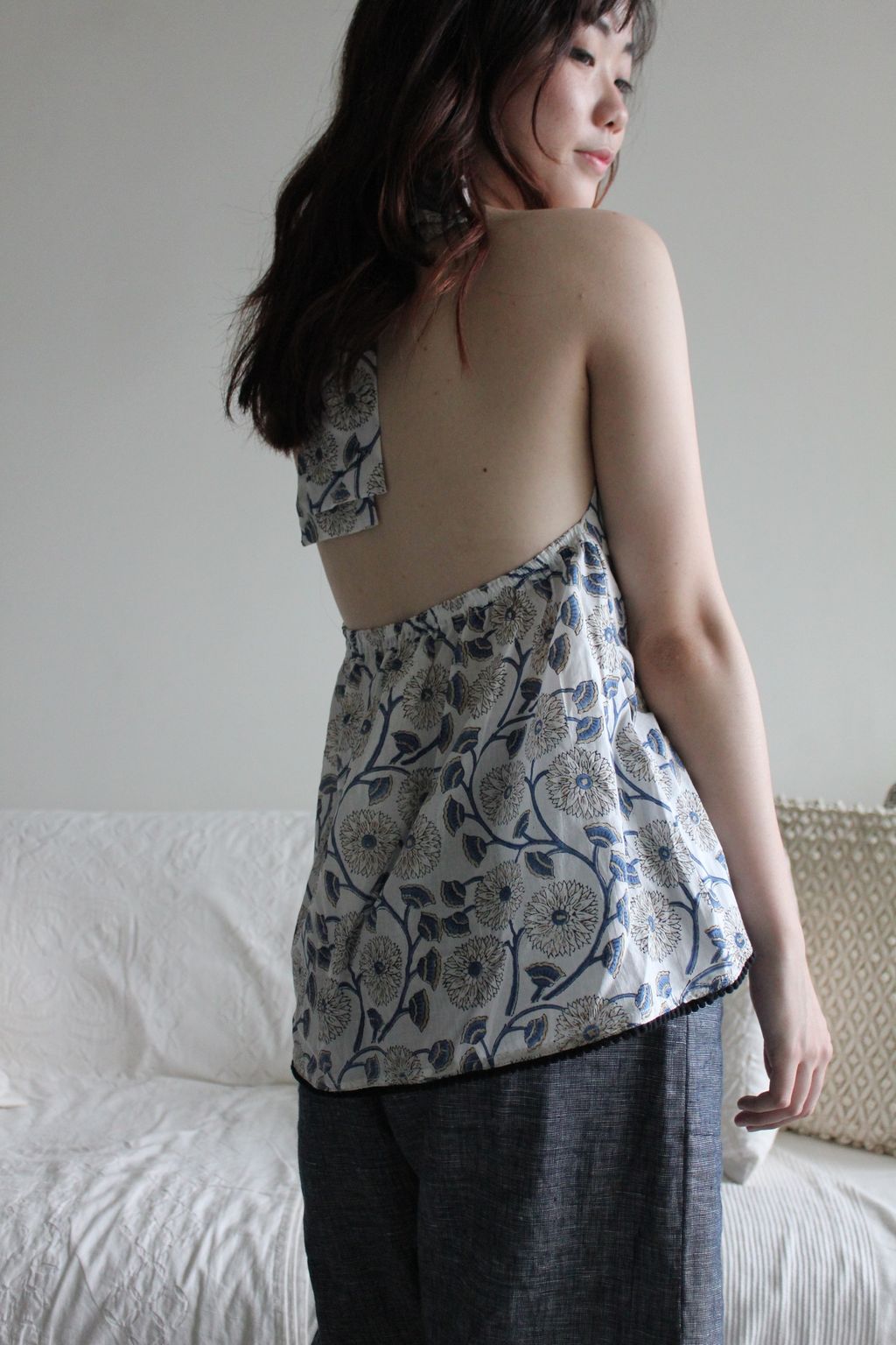 Oh la la, show off your shoulders and sexy back during your next beach getaway, or wear it on a fun day out over the weekend! This easy wearing top is light with a delightful big bow to tie behind your neck. The plunge of the neckline is not too low but at a nice depth. Made of 100% handblock printed cotton. Choose either mirror edging or pom-pom edging.