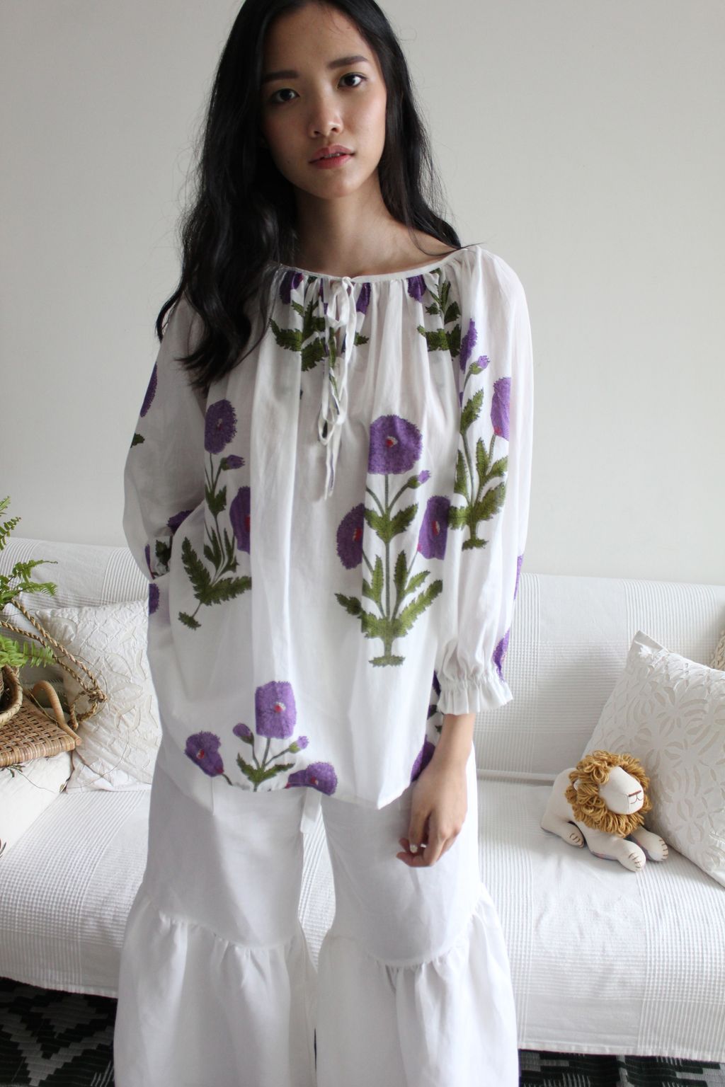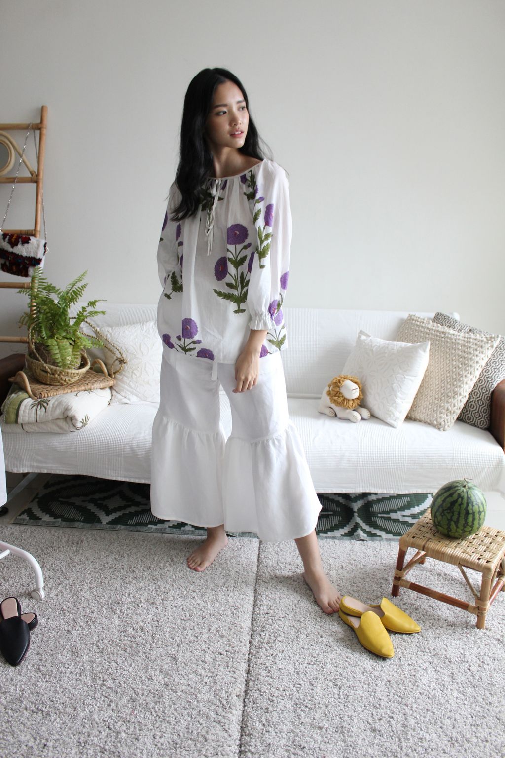 We all need a simple white peasant top. Modest, light and breezy. Best paired with our linen frou pants in Bianco or a white bottom.