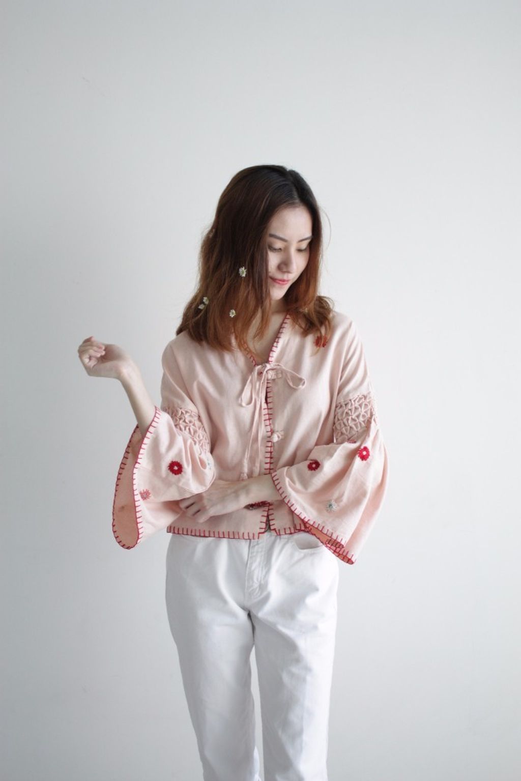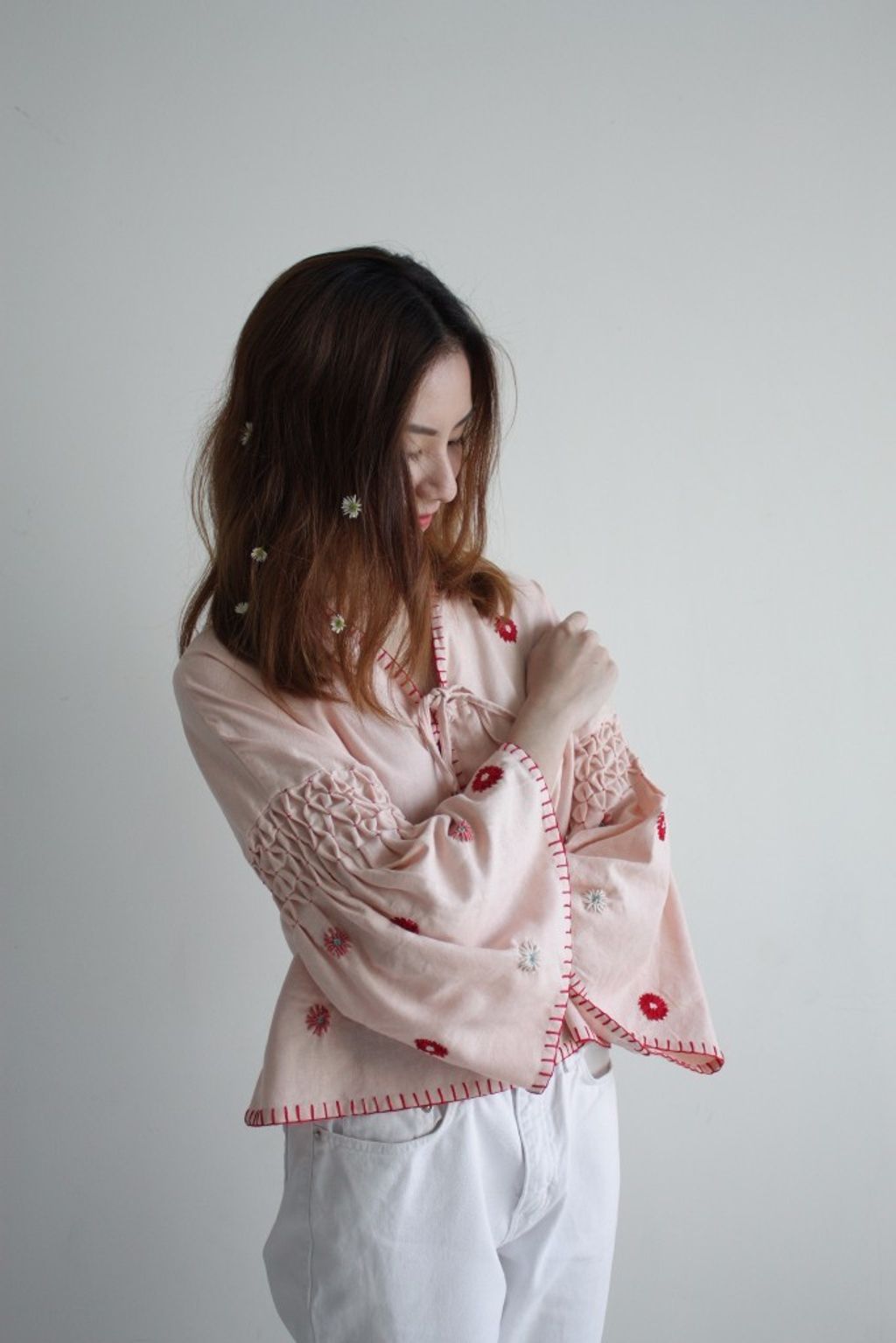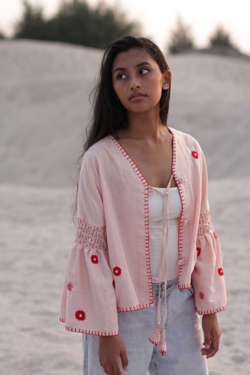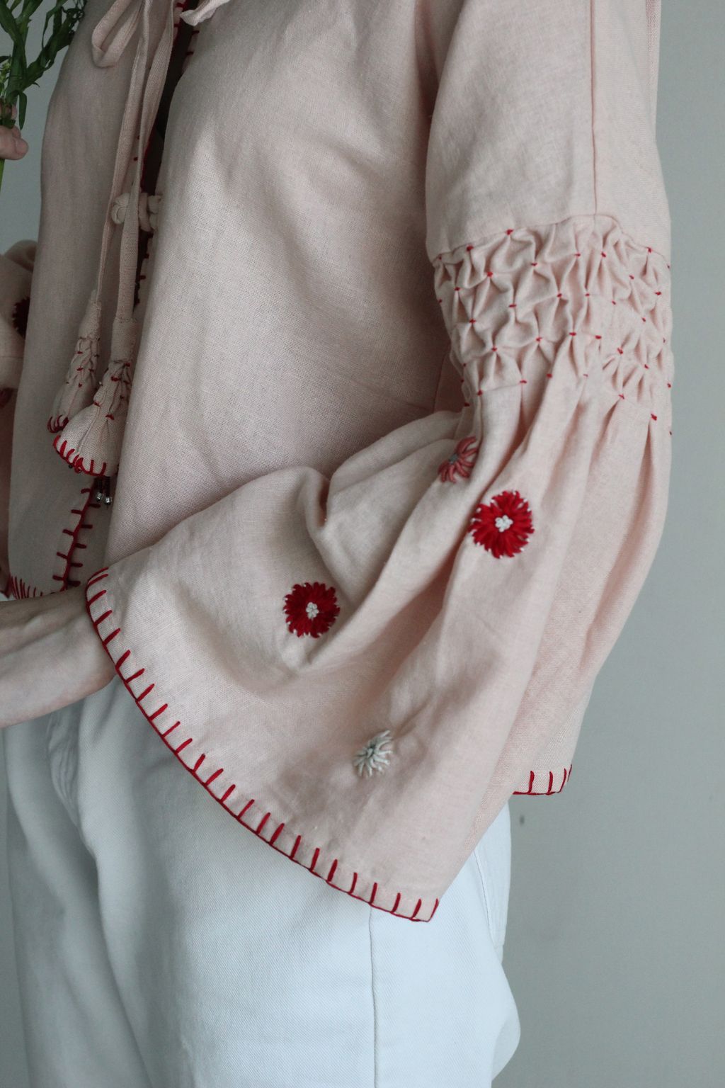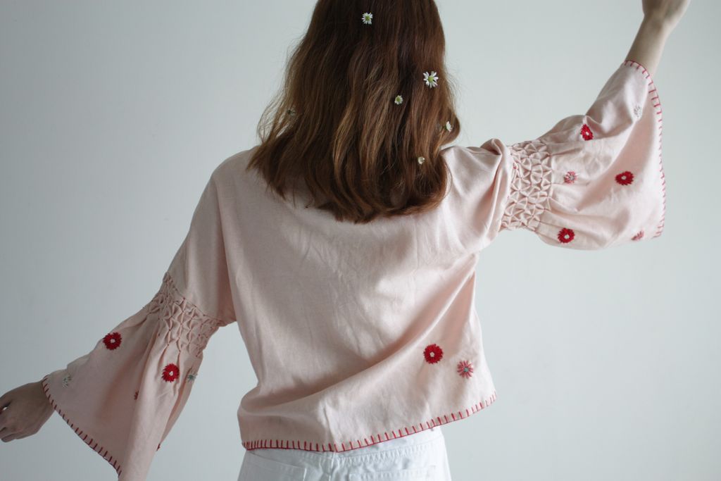 Each top is made of 100% linen and is fully finished with hand embroidery details. From the smocking at the sleeves, to the spontaneous flowers and the blanket stitch edging. Even the knotted buttons on this top are handmade in our studio. Wear this top open or buttoned up and tie it up with our flower tassel found in the centre front.