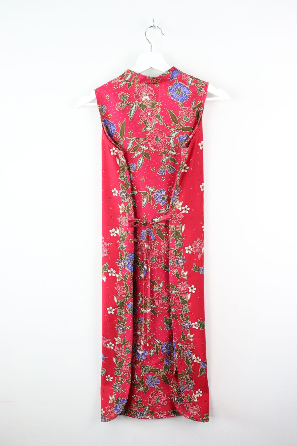 The hem of the dress is curved with side slits.