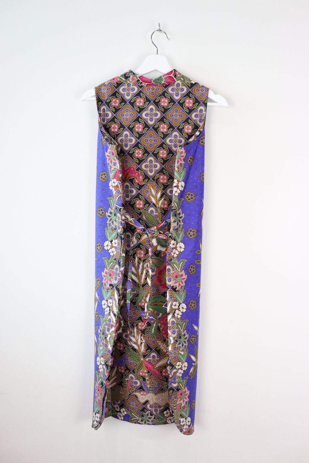 The hem of the dress is curved with side slits.