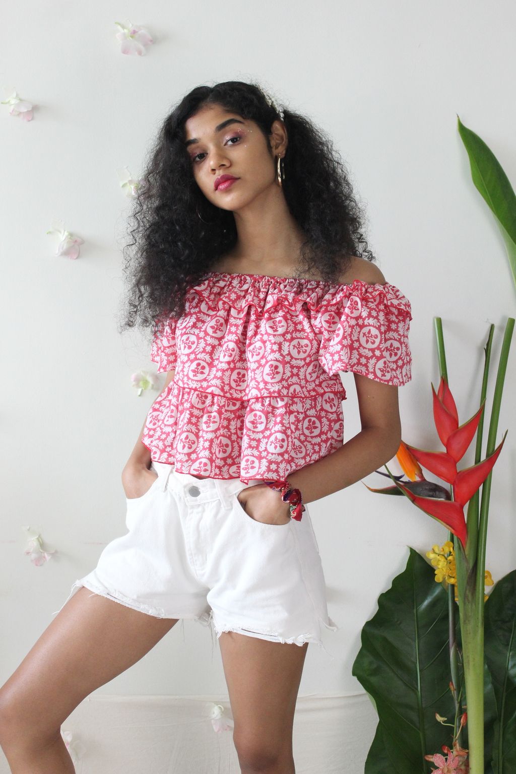Made of 100% hand blockprinted cotton. I personally throw this into my bag whenever i go on a tropical adventure and wear them on a daily basis! They are light, comfy and cute ! Frills are finished with red thread edging .